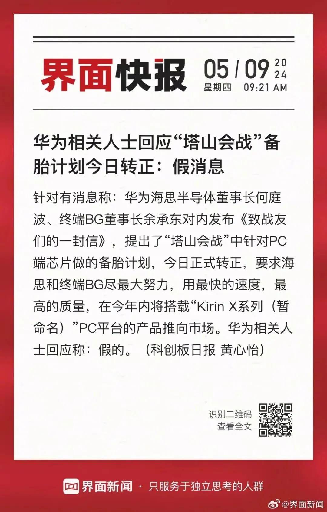 PC端芯片备胎计划转正?华为相关人士辟谣;沈子瑜卸任星纪魅族CEO;vivo 和蔡司续签合作* 图源水印,内容整合,不代表公众号立场,侵删* 爆料消息谨慎看待,以爆料者和实际为准早上好,今天是 2024 年 5 月 10 日,为各位读者带来近日的数码科技资讯~📰01 沈子瑜卸任星纪魅族 CEO [凤凰网科技报道] 沈子瑜卸任星纪魅族首席执行官沈子瑜卸任,由苏静接棒,同时湖北星纪魅族科技有限公司的法人也由沈子瑜变更为苏静。根据官网最新消息,此次调整后,沈子瑜也不在星纪魅族公开的六位主要管理人员名单中。现在6位管理层分别是CEO苏静、COO廖清红、CFO戚为民、执行副总裁兼手机事业部总裁黄质潘,执行副总裁兼CTO张亚东,执行副总裁兼战略规划负责人王勇。📰02集邦咨询大幅上调内存价格涨幅预期 [ZEALER 报道] 5月9日消息,DRAM内存芯片和内存条、NAND闪存和SSD硬盘正在新一轮的上涨周期中加速狂奔,集邦咨询在最新报告中大幅上调了二季度的价格涨幅预期,尤其是内存。2024年第一季度,内存芯片合约价格上涨了多达20%,原本预计二季度会小幅上涨3-8%,但是集邦咨询最新修正为13-18%。NAND闪存的趋势也类似,一季度已经涨了多达23-28%,二季度原本预计涨13-18%,但现在上调为15-20%。唯一利好的就是eMMC/UFS闪存,预计第二季度只会涨大约10%。📰03 OpenAI 发布 AI 生成图片检测器 [爱范儿报道] OpenAI 昨日官宣推出专用的 AI 监测工具,用于监测图片是否由其旗下 AI 图片生成工具 DALL-E 生成,准确率高达 98.8%。不过该公司表示,这个检测工具并非旨在检测 Midjourney 和 Stability 等其他流行生成器生成的图像。OpenAI 还宣布他们加入了内容来源和真实性联盟(C2PA)的指导委员会,C2PA 是一种广泛使用的数字内容认证标准,可用于证明内容来自特定来源。OpenAI 表示自今年早些时候,在 ChatGPT 和 OpenAI API 中创建和编辑的所有图像中,均添加了 C2PA 元数据。未来 Sora 也会集成 C2PA 数据。📰04vivo 和蔡司续签合作 5 月 9 日,vivo 宣布与蔡司进一步深化合作,正式签署全新的联合研发扩展协议,双方将继续拓宽合作边界,以追求长期可持续的创新生态系统为目标,共同探索移动光学的创新和关键技术,开发更出色的影像解决方案,为行业树立合作新范式。📰05 真我 GT Neo6 发布 [WHYLAB报道] 5 月 9 日,真我 GT Neo6 正式发布:12+256GB 售价 2099 元、16+256GB 售价 2399 元、16+512GB 售价 2699 元、16GB+1TB 售价 2999 元。这款新机的核心规格如下:- 芯片:骁龙 8s Gen 3 移动处理平台,LPDDR5X 内存,UFS 4.0 闪存,冰芯立体散热系统(10014mm² 散热 VC + 中框冰封结构),中端首发《原神》原生 1.5K 点对点渲染技术;- 屏幕:6.78 英寸 2780×1264 柔性 OLED 屏幕,京东方 S1 发光材料,1000nit 手动最高亮度、1600nit 全局激发亮度、6000nit 局部峰值亮度,支持 120Hz 刷新率(8T LTPO),2500Hz 瞬时触控采样率,2160Hz 高频 PWM 调光,3+1 Pulse 类 DC 低频闪技术,支持湿手触控(OTA),康宁 Victus 2 保护玻璃;- 相机:前置 32MP(索尼 IMX615),后置 50MP 主摄(索尼 LYT-600,OIS)+8MP 超广角(索尼 IMX355);- 续航:5500mAh 电池,支持 120W 快充,10 分钟充电 50%,SUPERVOOC S 电源管理芯片;- 其他:厚 8.65mm,重 191g,提供流银骑士、苍野骇客、灵犀紫 3 款配色,X 轴线性马达,支持 NFC、红外遥控,Wi-Fi 6 增强版,蓝牙 5.3,双频 GPS + 三频北斗,杜比全景声双扬声器,IP65 防尘防水认证,搭载 realme UI 5.0,首发 AI 燃模式。📰06 华为相关人士辟谣PC端芯片备胎计划转正 [新浪科技报道] 5月8日,网络上有传闻称,华为海思半导体董事长何庭波,终端BG董事长余承东对内发布《致战友们的一封信》,提出了“塔山会战”中针对PC端芯片做的备胎计划正式转正。要求海思和终端BG尽最大努力,用最快的速度,最高的质量,在今年内将搭载“Kirin X系列”PC平台的产品推向市场。针对华为对内发布《致战友们的一封信》的传闻,华为相关知情人士表示,该内容为假消息。📰07 腾讯测试两款全新社交产品[Tech星球报道] 腾讯正在测试两款全新的社交产品,试水新的社交赛道。一款为焦糖画风的密友搭子产品「轻团」,另外一款「代号 N1」,它与「轻团」不同,「代号 N1」则是集 MBTI(人格类型理论模型)、朋友圈为一体的社交产品。 据知情人士向 Tech 星球透露,两款产品都是去年立项,但两款产品并没有正式的名字,而是以「代号 X」为暂定产品名,其中,「轻团」此前为「代号 M9」。点赞、关注、分享,都是我坚持更新的动力