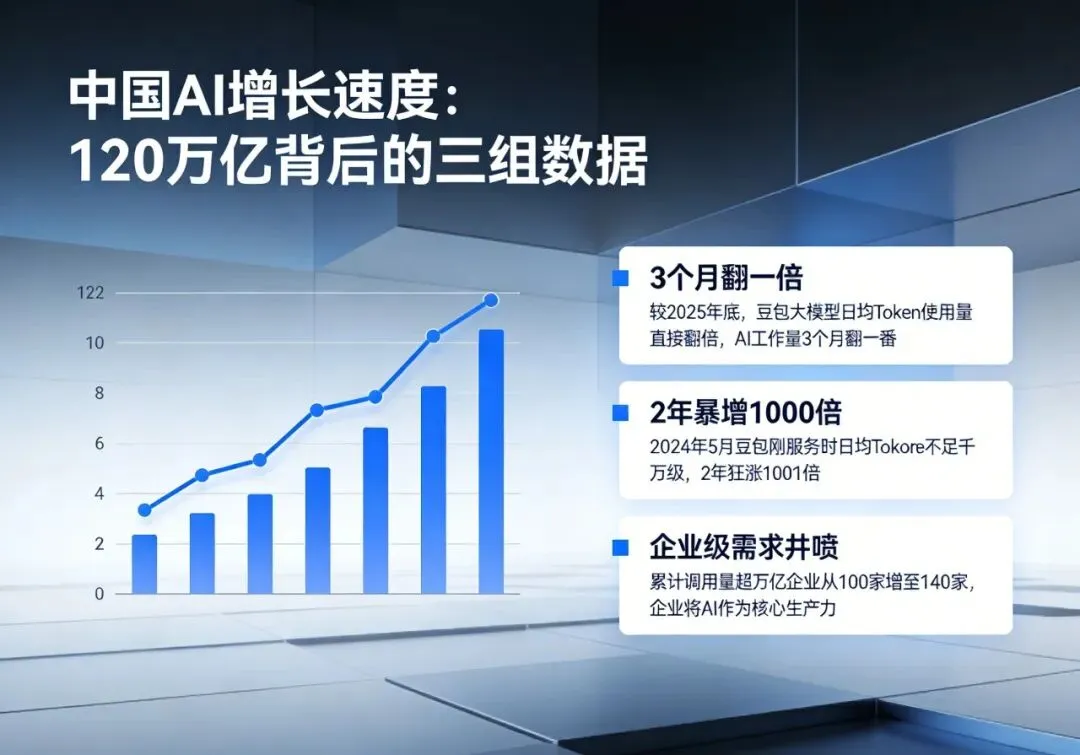 120万亿!一个数字,看懂中国AI有多火最近,火山引擎在武汉FORCE LINK AI创新巡展上,抛出了一个足以刷屏AI圈的数字——豆包大模型日均Token使用量,突破120万亿 ! 可能有人会说,“120万亿”听起来只是一串冰冷的数字,到底意味着什么?别急,今天就用最通俗的话,带你读懂这个数字背后的震撼,看清中国AI的爆发式增长。 核心亮点:截至2026年3月,豆包大模型日均Token(词元)使用量突破120万亿,这不是偶然,而是中国AI从技术突破走向规模化落地的最好证明。 先搞懂:Token到底是什么? 很多人对“Token”感到陌生,其实一句话就能讲明白——Token就是AI的“粮食” 。 就像我们人类吃饭补充能量,AI每做一件事,都需要消耗Token:思考一个问题、生成一段文案、画一张图片、完成一次数据分析、甚至帮你编辑一条短视频,每一个动作,都在“吃掉”Token。 简单来说,Token的使用量,直接反映了AI的“活跃度”和“普及度”。使用量越高,说明AI被用得越广、越频繁,越能融入我们的生活和工作。 120万亿,到底有多惊人?看三组对比就懂 单看120万亿可能没概念,但结合这三组数据,你就知道中国AI的增长速度有多恐怖: 3个月翻一倍 :较2025年底,豆包大模型的日均Token使用量直接翻倍,相当于短短3个月,AI的“工作量”就翻了一番,增长势头肉眼可见。2年暴增1000倍 :回溯到2024年5月,豆包大模型刚对外提供服务时,日均Token使用量还不足千万级,短短两年时间,狂涨1000倍,堪称“指数级爆发”。企业级需求井喷 :不仅个人使用频繁,企业端的需求更是爆发式增长——累计调用量超万亿的企业,从100家增至140家,越来越多企业开始把AI当作核心生产力。这个数字,藏着我们身边的AI变革 可能有人会问,120万亿的Token消耗,到底花在了哪里?其实,它就藏在我们的日常生活和工作里,只是我们常常习以为常。 职场上,员工用AI写报告、做PPT、分析数据,原本需要一天完成的工作,现在几小时就能搞定;企业里,AI帮着优化供应链、分析客户需求、搭建智能客服,降低成本的同时,效率翻倍。 生活中,我们刷到的AI生成短视频、用到的智能翻译、咨询的AI助手,甚至手机里的智能拍照、语音识别,背后都在消耗Token。120万亿,意味着AI已经像水和电一样,渗透到每一个角落,成为我们离不开的“工具”。 不止是数字,更是中国AI的底气 120万亿这个数字,从来不是火山引擎一家的成就,更是中国AI产业的里程碑。 过去,我们总在讨论AI技术有多先进、多厉害,但现在,120万亿的使用量证明:中国AI已经走过了“技术比拼”的阶段,正式进入“规模化落地”的爆发期。 它告诉我们,AI不再是实验室里的“黑科技”,不再是少数人的“玩具”,而是能实实在在帮到每个人、每个企业的新型生产力。而火山引擎豆包大模型的爆发式增长,也恰恰印证了中国AI技术的硬实力——不仅能做好,还能普及好。 写到最后,再回头看“120万亿”这个数字,它不再冰冷,而是充满力量。它见证着中国AI的飞速发展,也预示着一个全新的智能时代,已经真正到来。 未来,随着AI技术的不断普惠,还会有更多“万亿级”的突破,而我们,都将是这个时代的见证者和受益者。 ✨ 互动话题:你平时会用AI做什么?有没有被AI的效率惊艳到?评论区聊聊~