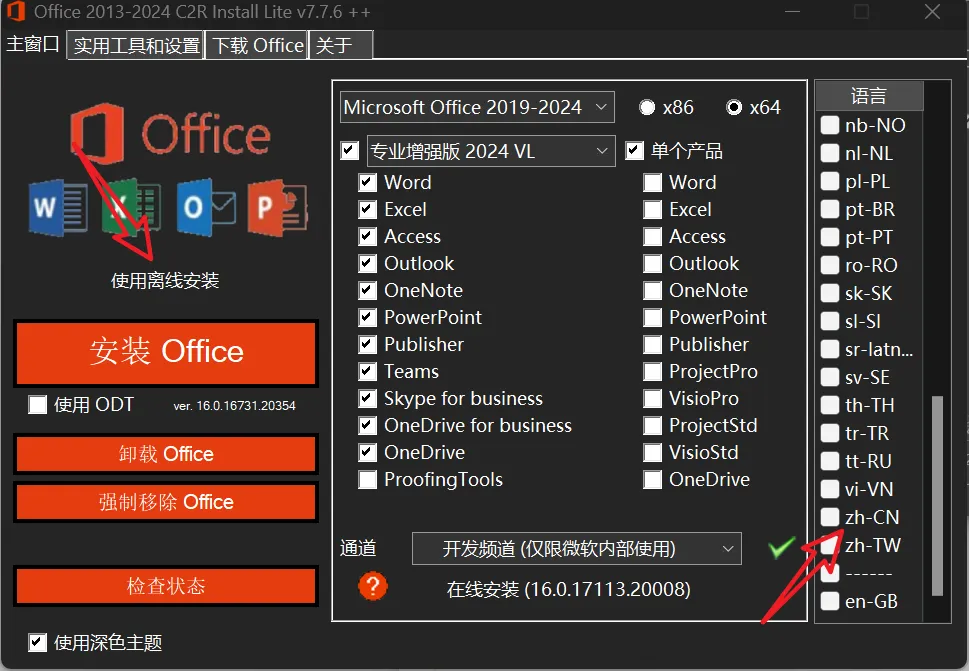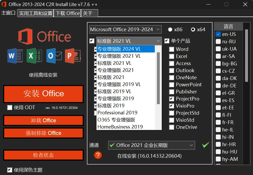 软件可在线安装,也可以离线安装,可以选择Office版本,也可以选择Office组件,最后的是大家一定要选择语言。