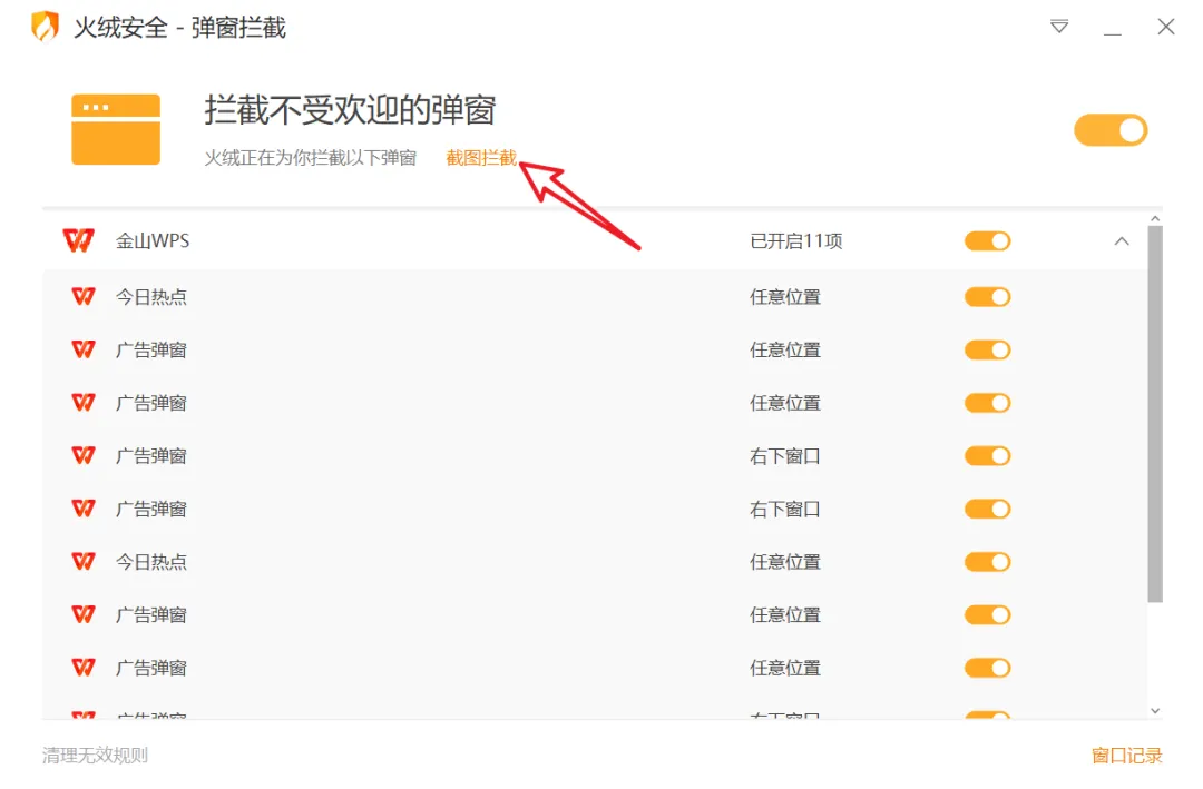 软件默认已经屏蔽了一些流氓软件,如果没有在软件屏蔽列表里的软件,可以点“截图拦截”,然后通过截图的方式拦截弹窗。