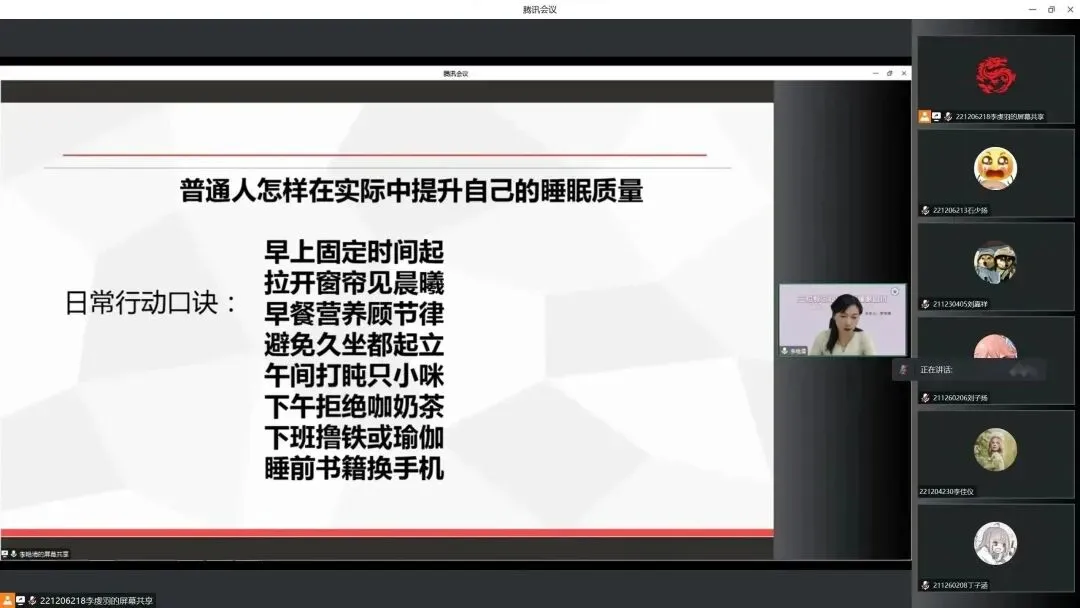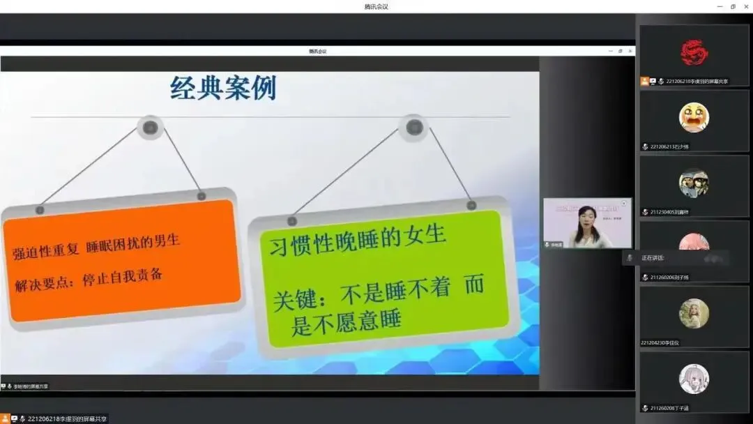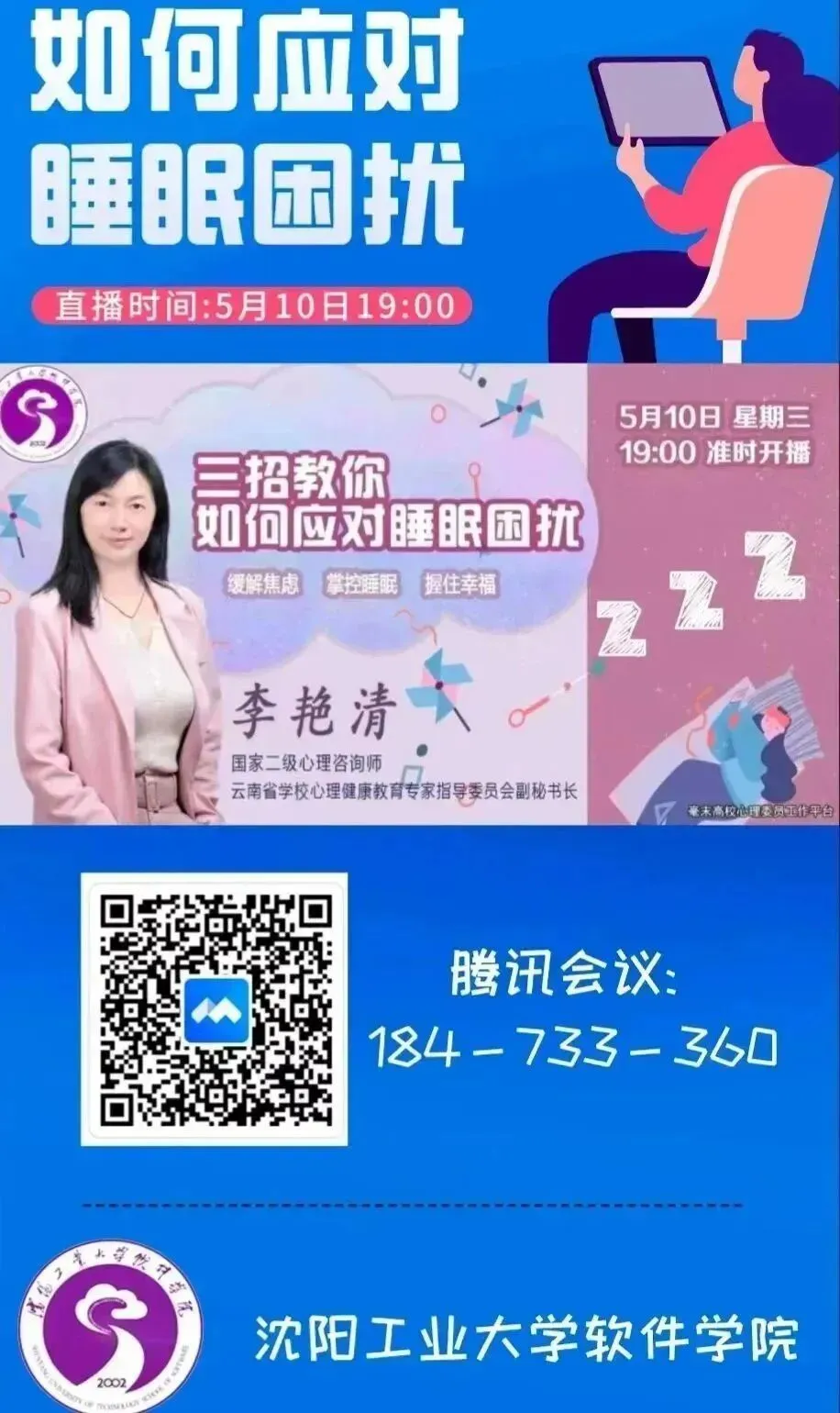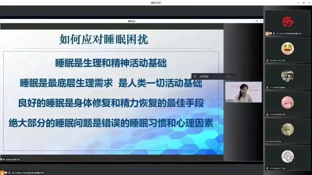 睡眠是人体的一种主动过程,可以恢复精神和解除疲劳。良好的睡眠质量,会促进人的身心健康发展。在日常生活中,有些同学总是在睡眠上有很大的问题,时常让自己感到烦恼。5月10日,软件学院组织开展“三招教你如何应对睡眠困扰”线上心理健康讲座。讲座由云南省学校心理健康教育专家指导委员会副秘书长李艳清老师主讲,李老师在云端与同学们畅聊睡眠问题。