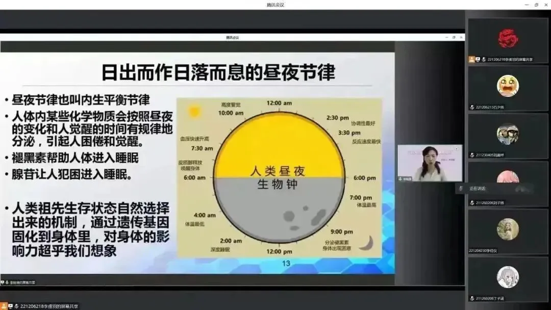 李老师从生活实际出发,讲到睡眠是人类生理和精神最基础的活动,绝大多数的睡眠问题是错误的睡眠习惯和心理因素产生的。要想解决睡眠问题我们需要了解自己的生物钟,日出而作日落而息的昼夜节律是人类祖先生存状态自然选择的机制,通过遗传基因固化到身体里,对身体的影响超乎我们想象,所以及时调整生物钟则是应对睡眠困扰的重要方法。