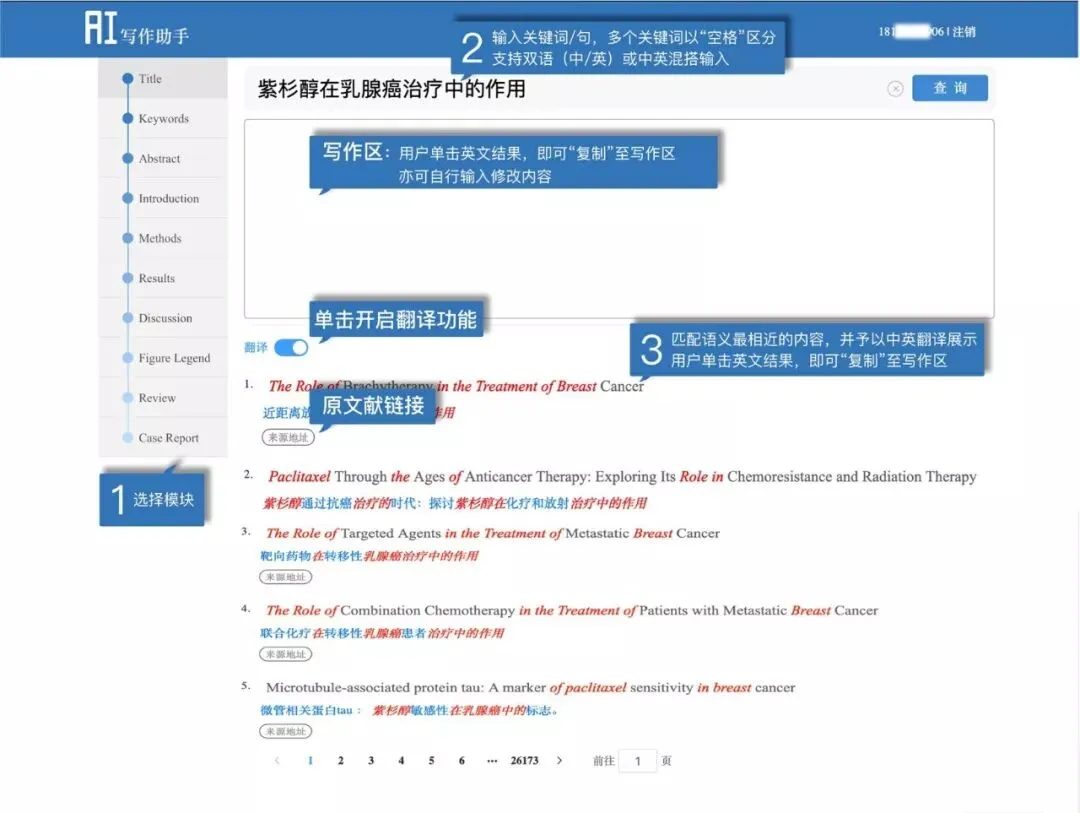 也就是说,这个数据库里目前有1100万条已经发表的SCI句子,被分配到论文的各个模块,要写哪一部分,就选哪一个模块,输入关键词,立刻获得想要的句子.