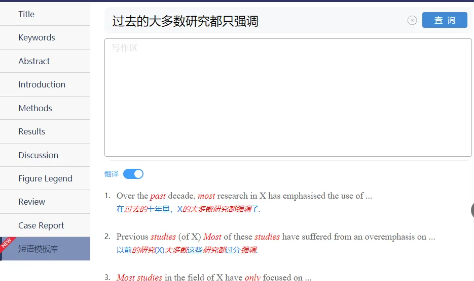 网站相比之前,增加了“短语模板库”模块,小编尝试了下,输入“过去的研究未能清晰解释”,这样的描述在Background或者Disscusion里会用到,为了引入当前文章有多牛逼牛逼...