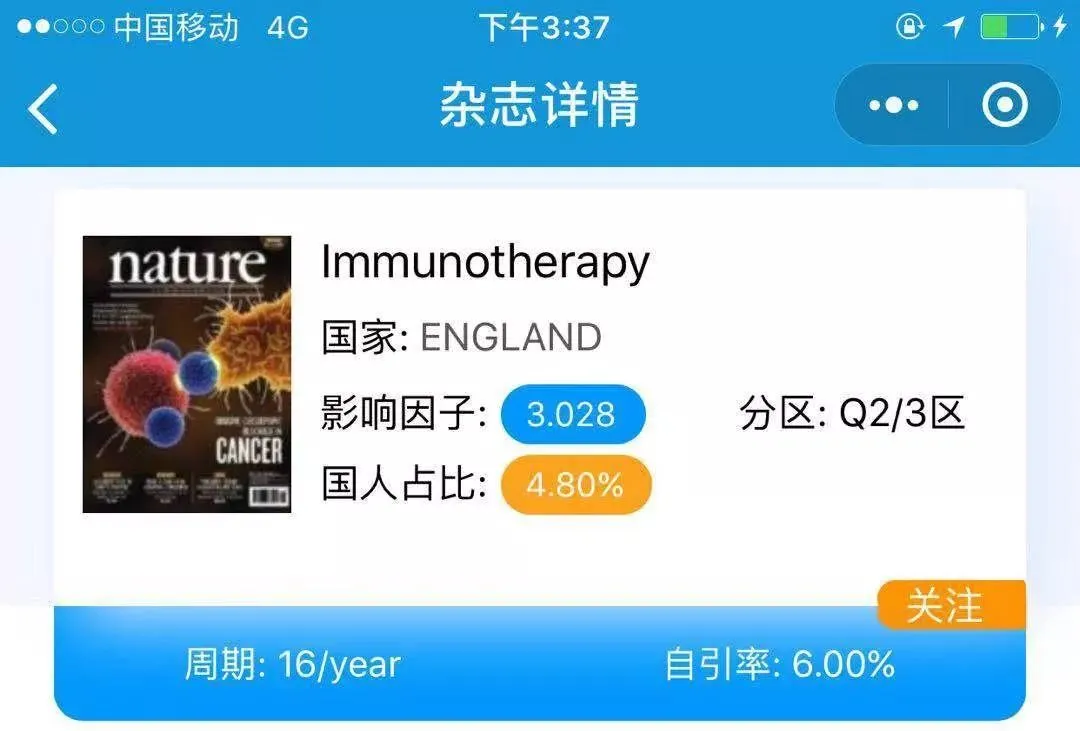 大家可以看到这篇文章发表在2018年的immunotherapy上,通过之前介绍过的小程序IF查与投查询,很快就可以知道期刊的影响因子是3分+。