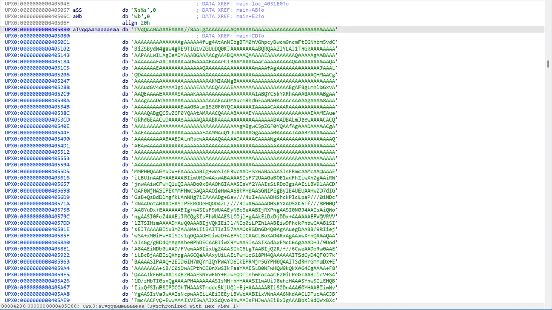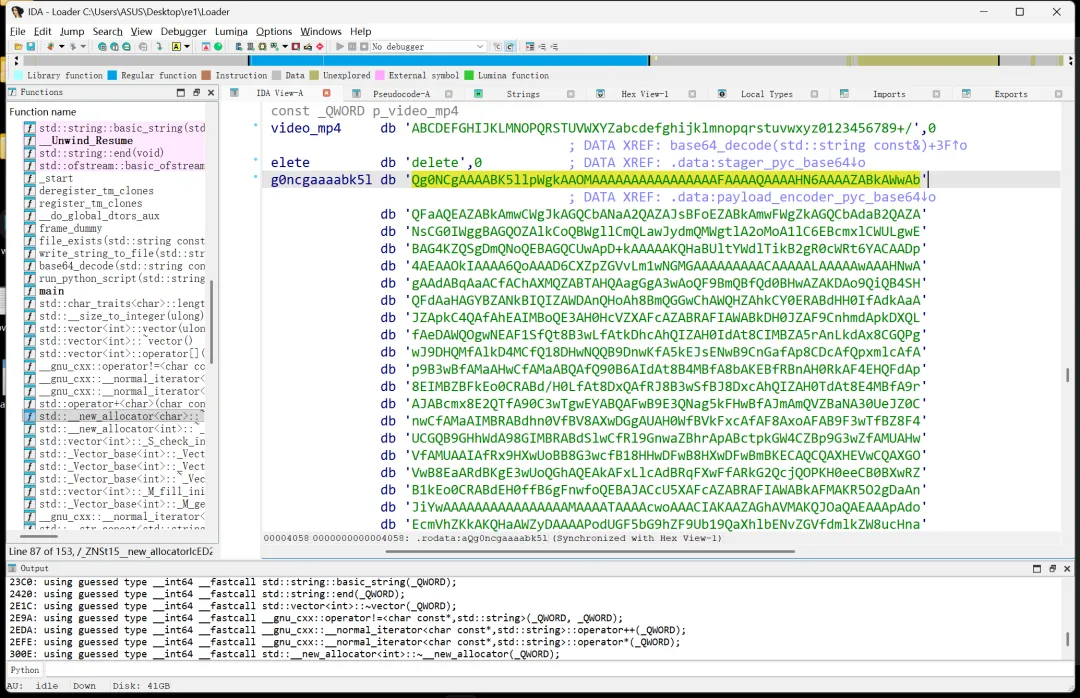 解包出来可以看到一个视频和一个 elf 文件,我们先用 ida 查看 elf 文件并获取相关信息,可以找到一个 base64 加密的长数据。