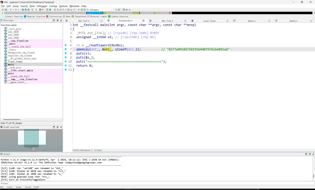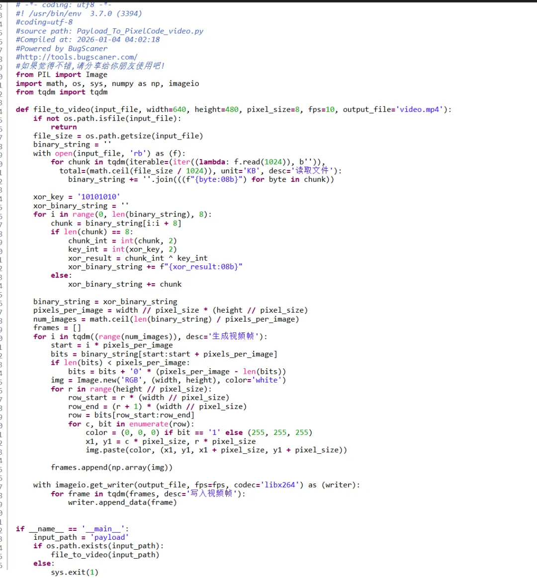 from pathlib import Pathimport imageio.v2 as imageiovideo=Path("video.mp4")pix=8w,h=640,480xor=0xAAbits=[]for frame in imageio.get_reader(video):for i in range(0,h,pix):for j in range(0,w,pix): block = frame[i:i+pix,j:j+pix] bits.append("1" if block.mean() < 128 else "0")data = bytearray()for i in range (0, len(bits), 8): b=bits[i:i+8] data.append(int("".join(b), 2) ^ xor)Path("payload.bin").write_bytes(data)解密完我们发现是一个 elf 文件,直接改名拖入 ida 中查看逻辑: