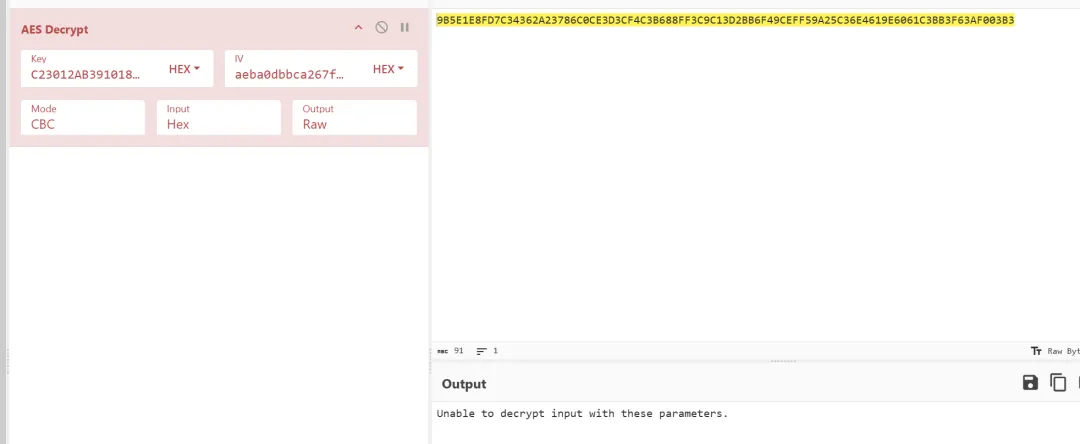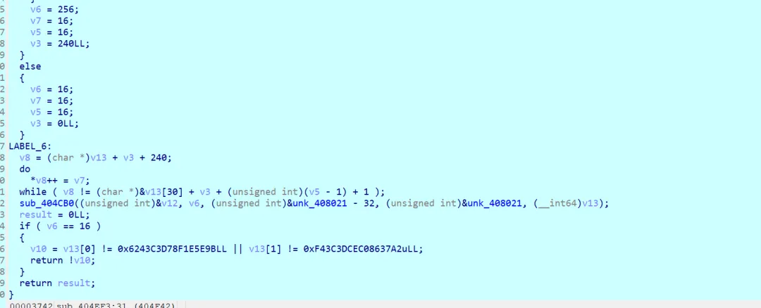 函数sub_404CB0是关键加密代码,分析之后可知是 aes-cbc 模式的加密, v12 是输入的 key,传入的参数分别是 key 和 iv,密文是底下 v13 的两个数。