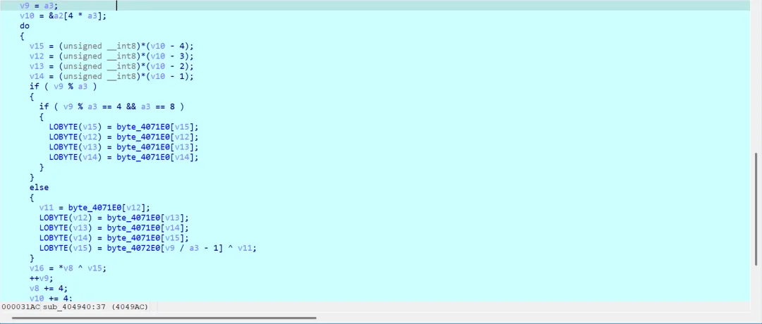以及在函数sub_404940中可以看出,这个 aes 先做了轮密钥加,再做了列混淆: