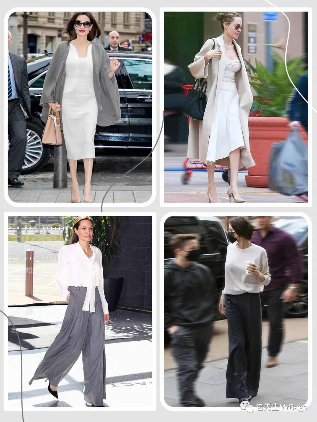 除了Sesia,朱莉还有很多相对比较低调的包款,基本都很适合她简约舒适的穿搭,特别能衬托出那种高级大方的气质。对于职场人来说,就算不买同款,其实也完全可以参考下她选择的风格!其实不只包包,女神能够时刻保持优雅、得体的风格,她的着装也功不可没!接下来包先生就顺便给大家总结几个朱莉穿搭法则,手把手给大家分析一下她的穿搭秘诀!朱莉着装的第一大秘诀,就是穿一身同色服装。在她的私服中经常能看到一身黑、一身裸色、一身白或一身灰的搭配。这样整体look看起来特别和谐、舒服,既有层次感又有设计感。最后再加上一只稍微厉害点的包,造型感也就上来了,又完美地突出了人的气质!如果不是一整身都是同色,朱莉则会善用各种中性色混搭,比如棕色、裸色或者黑、白、灰三色。大地色系本来就会给人一种很高级的感觉,混搭起来也不容易出错,同时也显得整体更加大气。在朱莉的私服穿搭中,我们经常能看到半裙+高跟鞋的搭配。半裙能够起到拉高腰线的作用,尤其有些修身的铅笔裙为更佳!再搭配简单而不失设计感的上衣,整体非常干练。然后再穿上更加提气的高跟鞋,也是职场人士不易出错的通勤选择!女神日常穿搭的最后一大秘诀,就是在look中保有适当的留白,也是我认为朱莉穿衣风格中最大的一个特点。朱莉以前算公认的性感女神,但现在的她其实私下很少有特别清凉或显露身材曲线的穿着。整体是稍微保守一些的服装,让人觉得很得体,而且不紧紧裹在身上的衣服,反而会有飘逸的女神感~不过,朱莉还是会露出非常纤细的手臂、脚踝或者锁骨,所以整身穿搭是有呼吸感的,完全不会让人觉得厚重。这样就做到了显气质的同时又不失女人味,也是非常值得大家参考的模板,尤其适合职场或是一些重要场合。好了,安吉丽娜·朱莉的包包和穿搭,今天就给大家分享到这里啦!朱莉的包包中,你最喜欢哪款?她的私服穿搭哪一点最吸引你呢?如果你当她的造型师,还会给她推荐哪些包款?