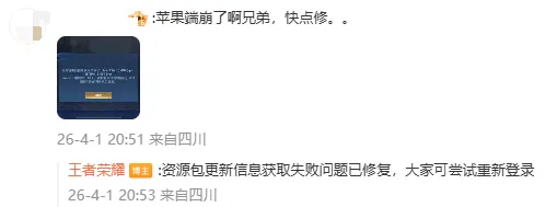 此外,还有网友在王者荣耀评论区晒出一张显示“资源包更新信息获取失败了”的游戏截图,对此,官方回复道:“资源包更新信息获取失败问题已修复,大家可尝试重新登录。”