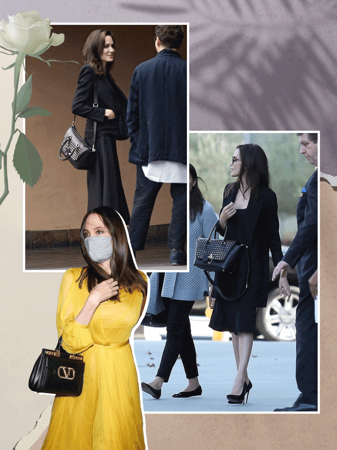 比如朱莉背Roman Stud的时候,就穿了一身黑!
