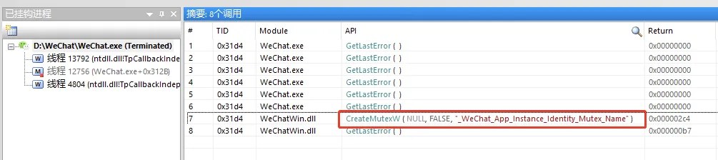 接着,启动神器APIMonitor,它可以帮你监控指定进程的API调用情况,勾选上CreateMutex和GetLastError这两个Windows API函数。在已经有微信在运行的情况下,用这个工具再启动一个微信进程,看一下函数调用情况: