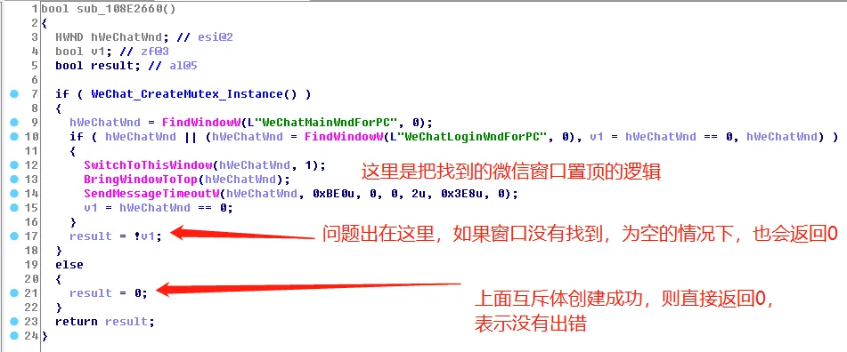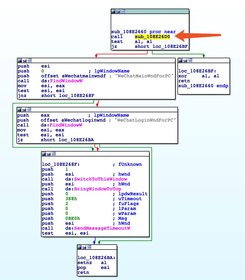 如果sub_108e26d0的返回值不为0,表示出现了错误,则依次判断WeChatMainWndForPC和WeChatLoginWndForPC两个窗口是否存在,如果存在则使用BringWindowToTop函数将其置顶弹出。这两个窗口分别代表的是微信的主界面窗口和登陆界面窗口,如果一个微信实例已经存在,则势必处于这两种状态之一。