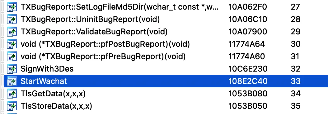 在WeChatWin.dll中,上面的创建互斥体再上一级函数名字叫StartWaChat,也是作为导出函数被该DLL导出: