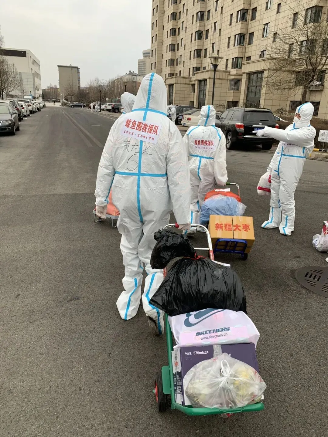 因疫情防控要求,个别地区个别小区实行了封闭管理。为保障居民基本生活,软件学院志愿者运送起了生活物资。东西沉重,天气寒冷,穿上防护服的志愿者行动起来还有些笨重,有的地址和电话留得不准确,运送物资存在很大的困难。但是他们没有被困难吓倒,互相打气,顺利完成了运送物资工作。