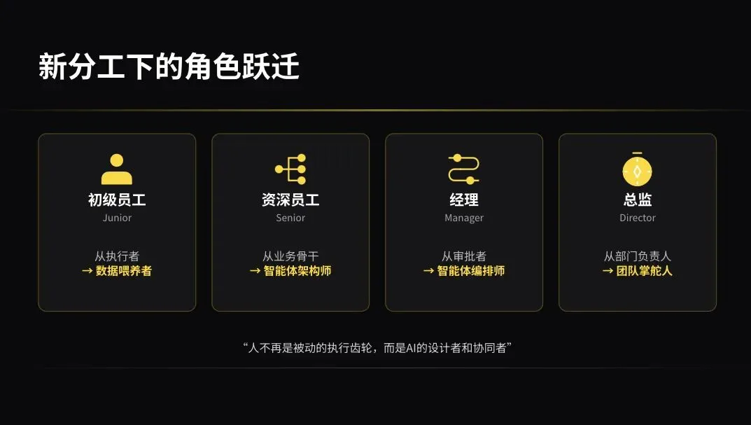 🔄 新组织分工范式• 初级员工(Junior):从执行者→智能体“数据喂养者”,负责整理标准化素材、标注业务场景,为AI提供高质量执行与训练基础。• 资深员工(Senior):从业务骨干→智能体“架构师”,设计Agent决策逻辑、业务边界与协作规则,让AI精准匹配企业需求。• 经理(Manager):从审批者→智能体“编排师”,统筹多个Agent协作流程,让不同智能体各司其职又高效联动,共同完成复杂交付物。• 总监(Director):从部门负责人→智能体团队“掌舵人”,把控技术选型、伦理边界与团队迭代。• 最高管理层:依然是组织战略核心,负责把握方向、定义价值主张。