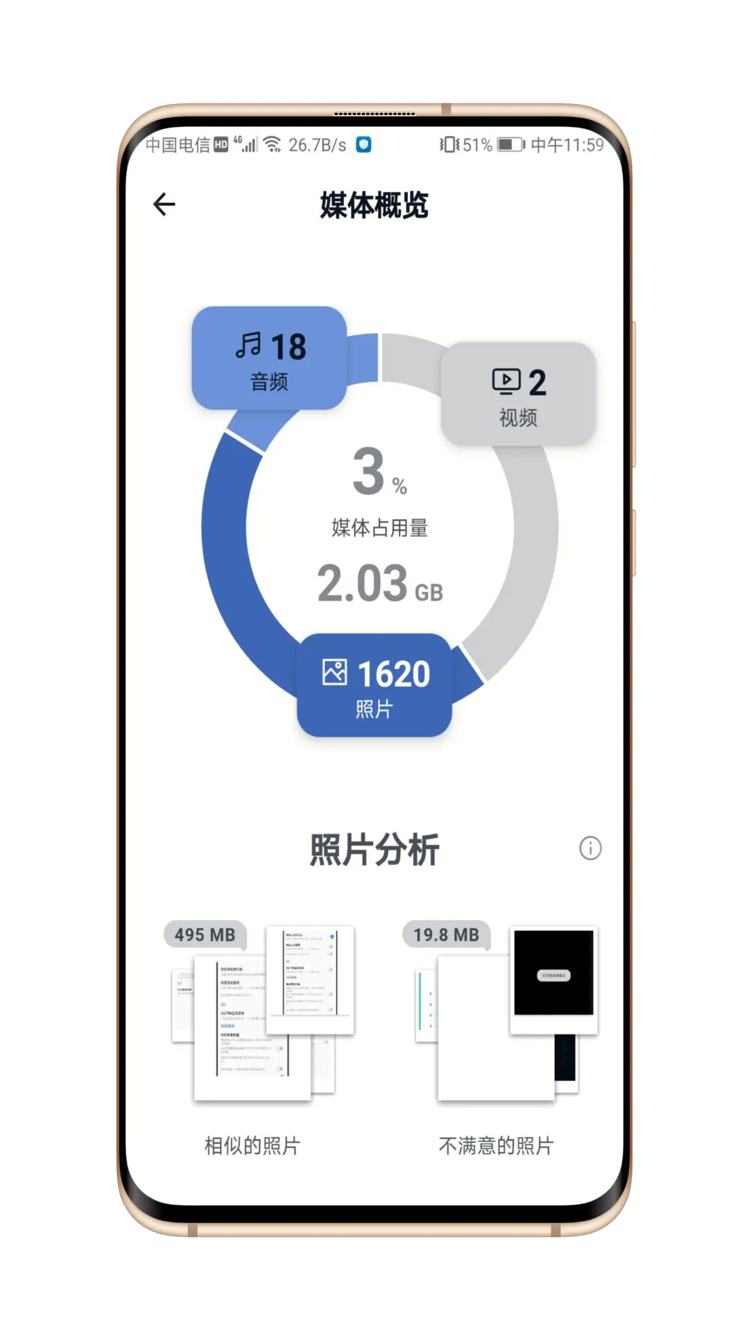 这是软件没有广告和弹窗,打开就能直接使用,并且已解锁Pro功能,第一次使用会有教程。软件界面简约明了,能看到手机空间的使用程度,以及哪些内容占用了多大的空间。