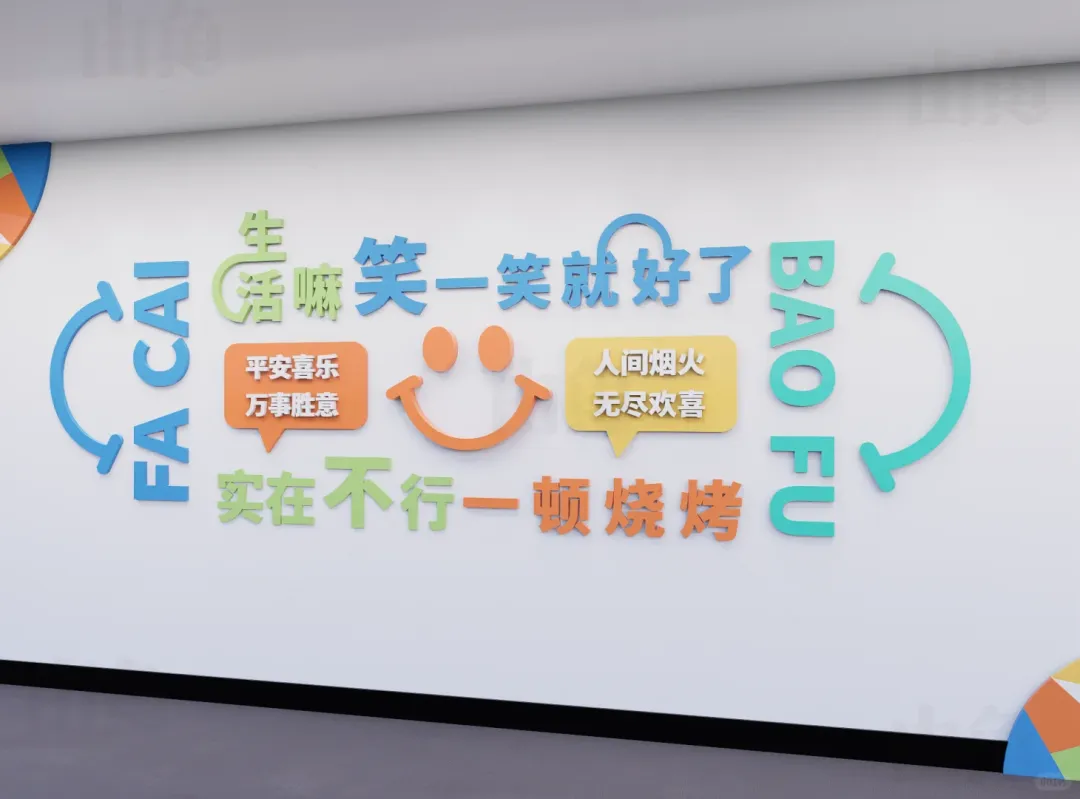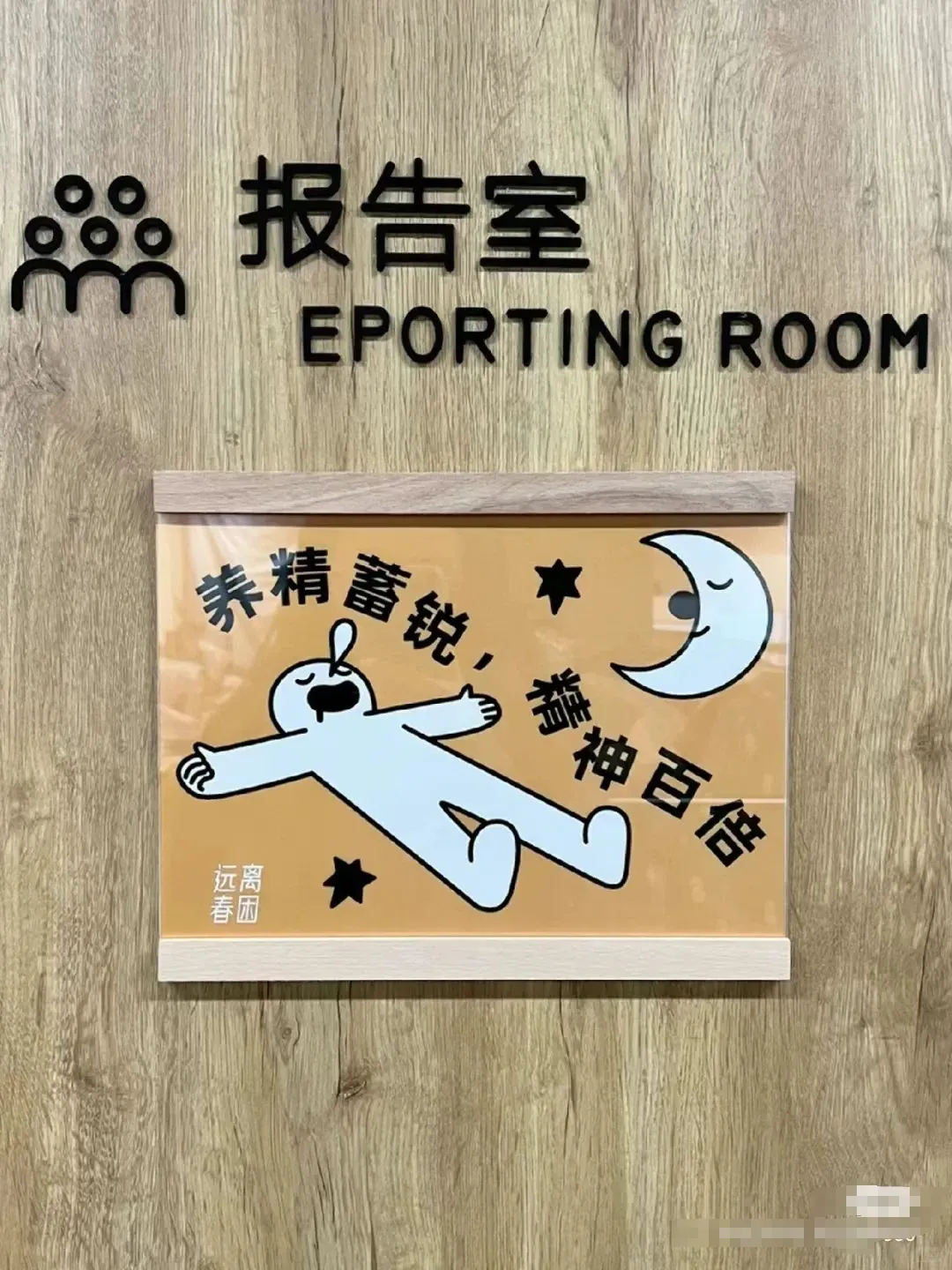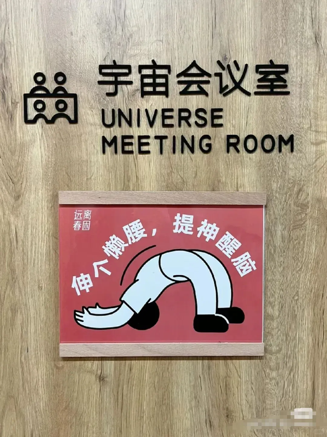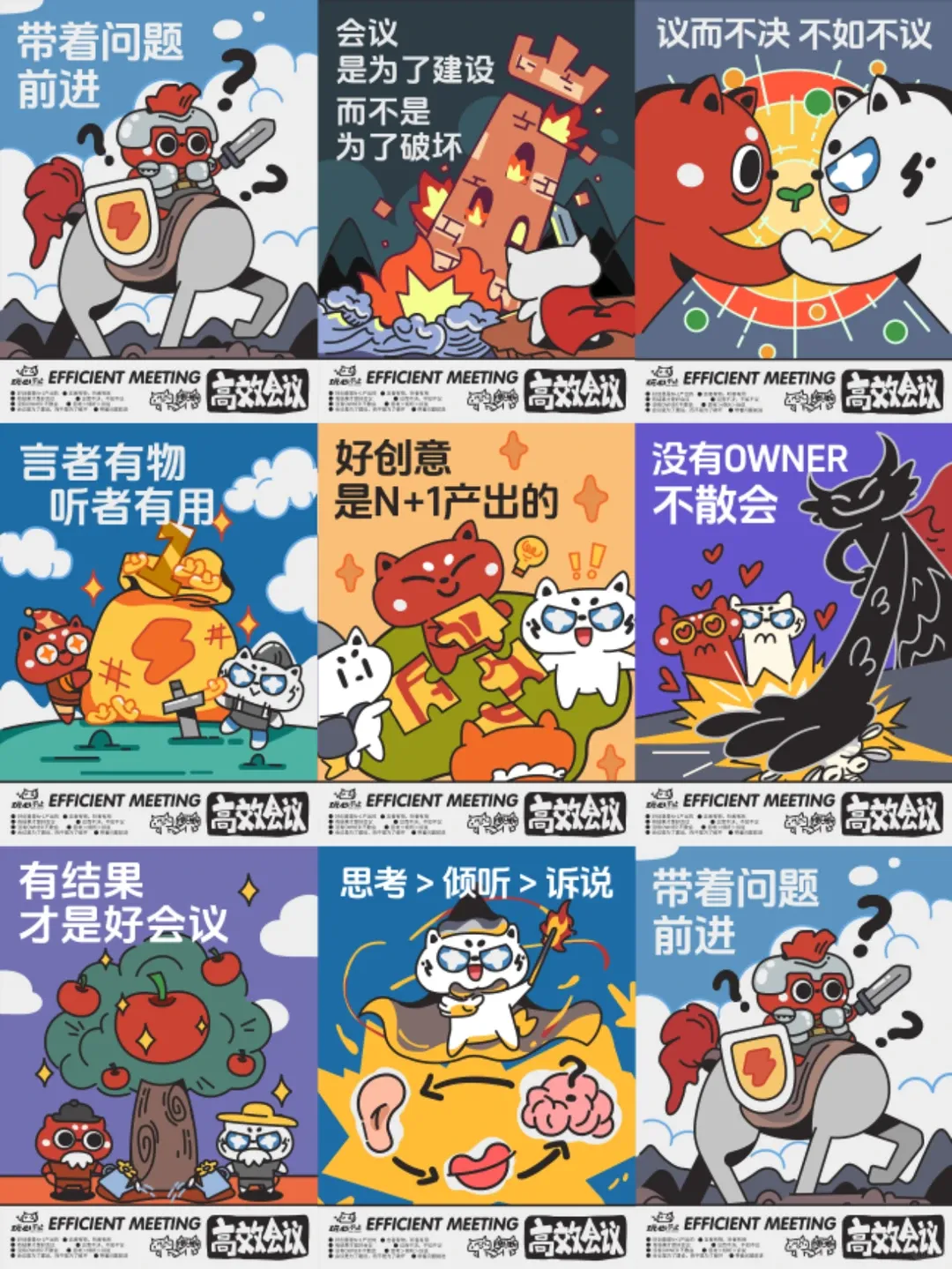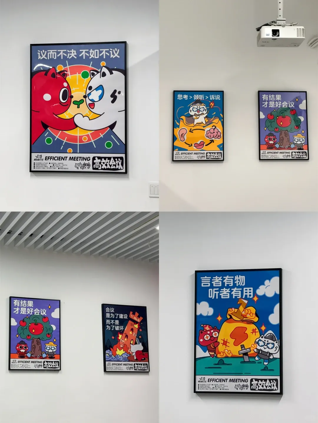 开会最怕的不是议题难,而是会而不决,决而不行。会议室里的标语存在的目的就是帮大家省时间,提高开会的效率。比如玩心不止的会议室,就结合公司IP形象,生动直观的表达高效会议的要求: