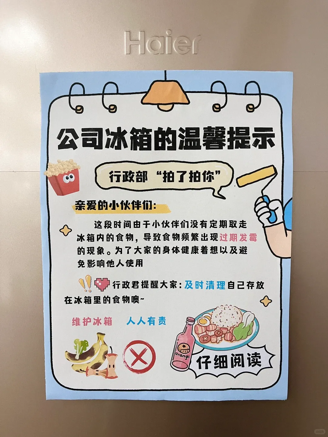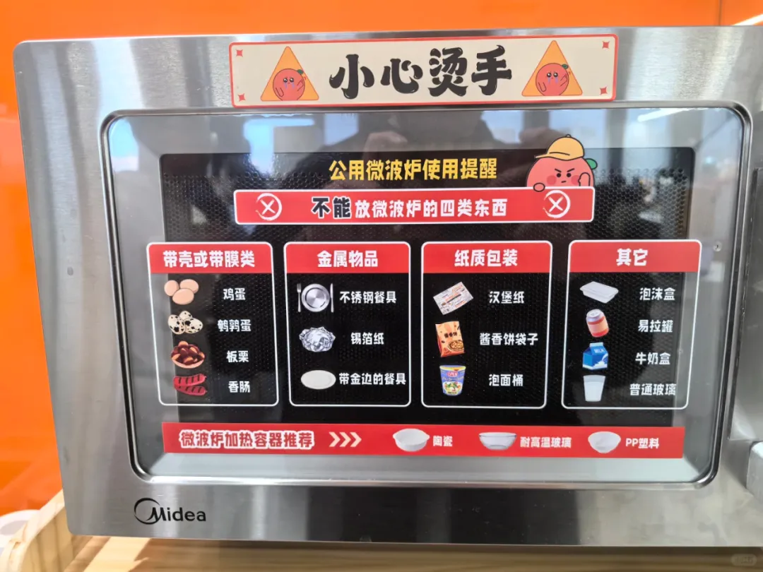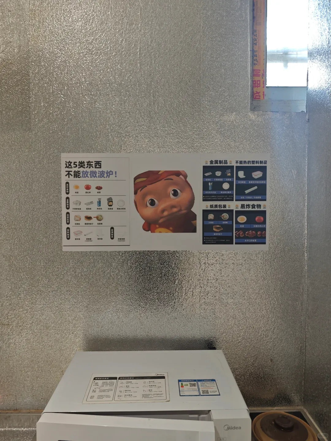 茶水间的标语,主要是一些温馨提示,提醒大家设备如何使用、保持冰箱清洁等。比如关于微波炉使用的温馨提示: