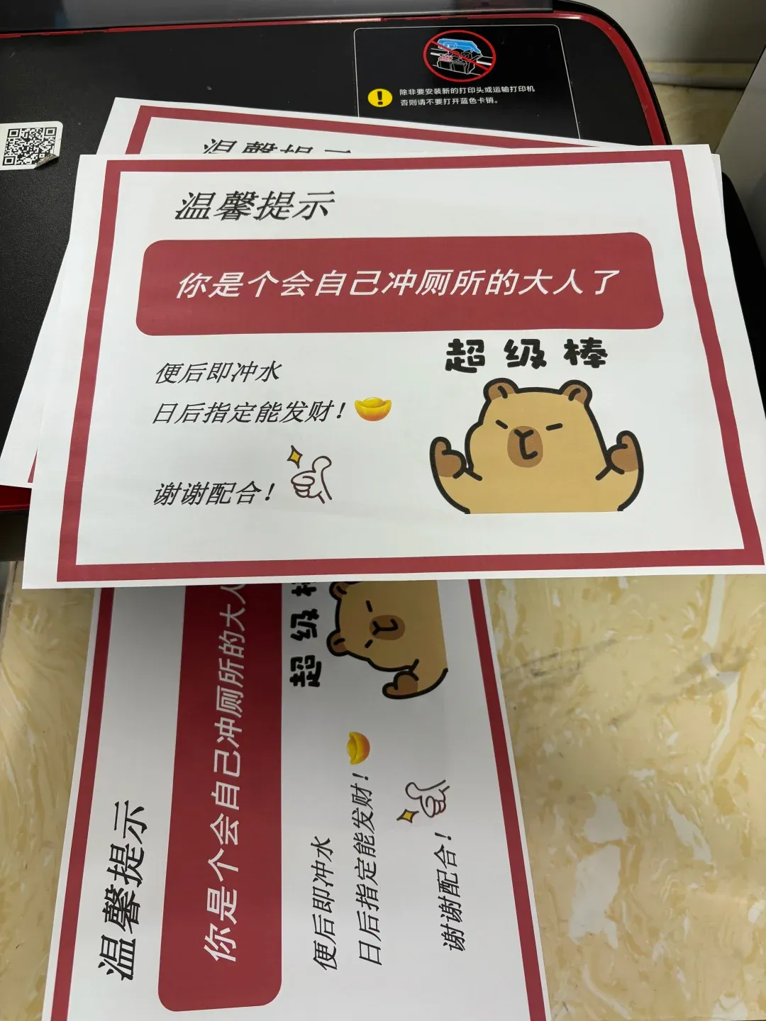 卫生间的标语主打一个别太严肃,但该提醒的卫生问题,一个也不能少。