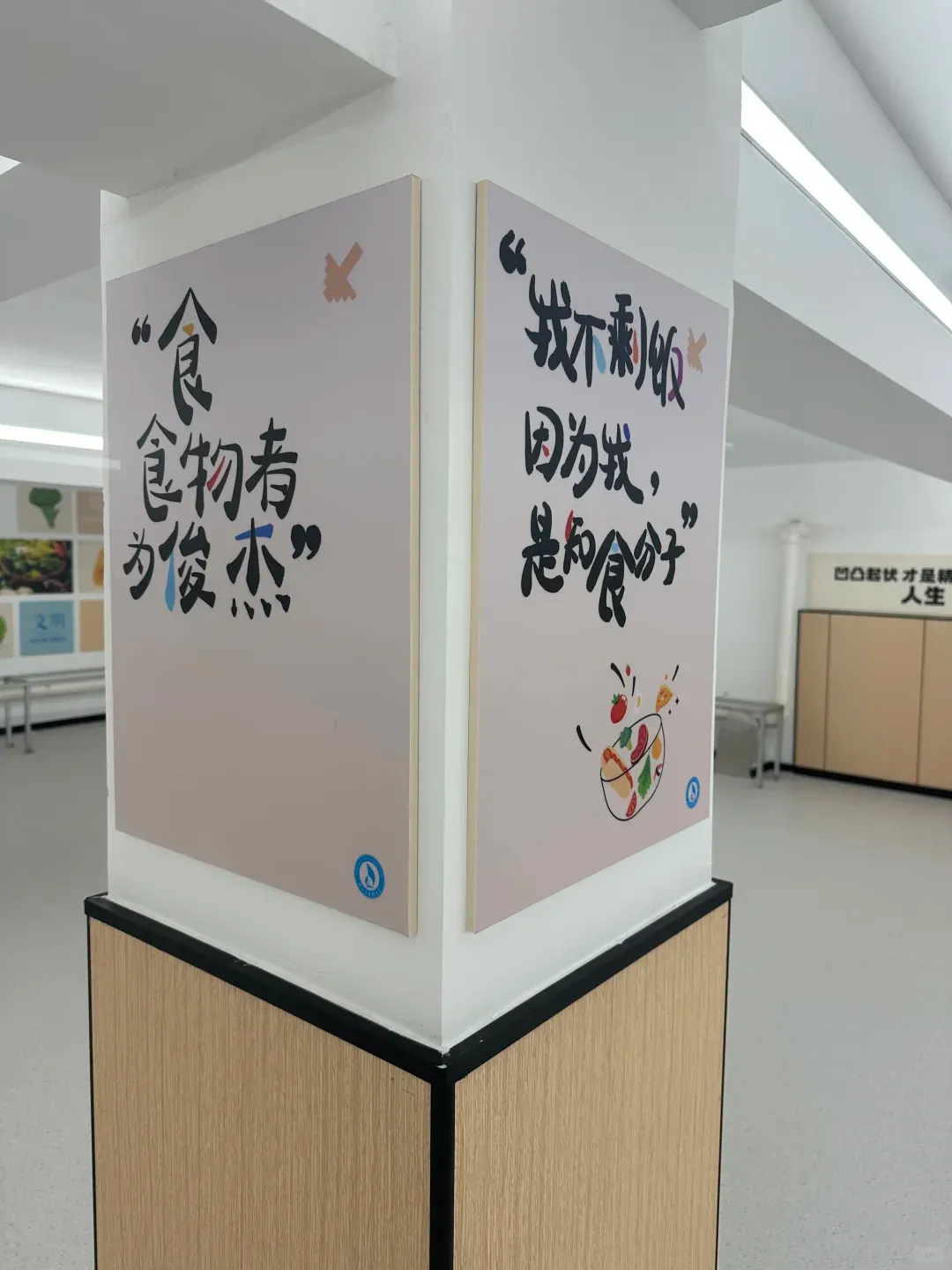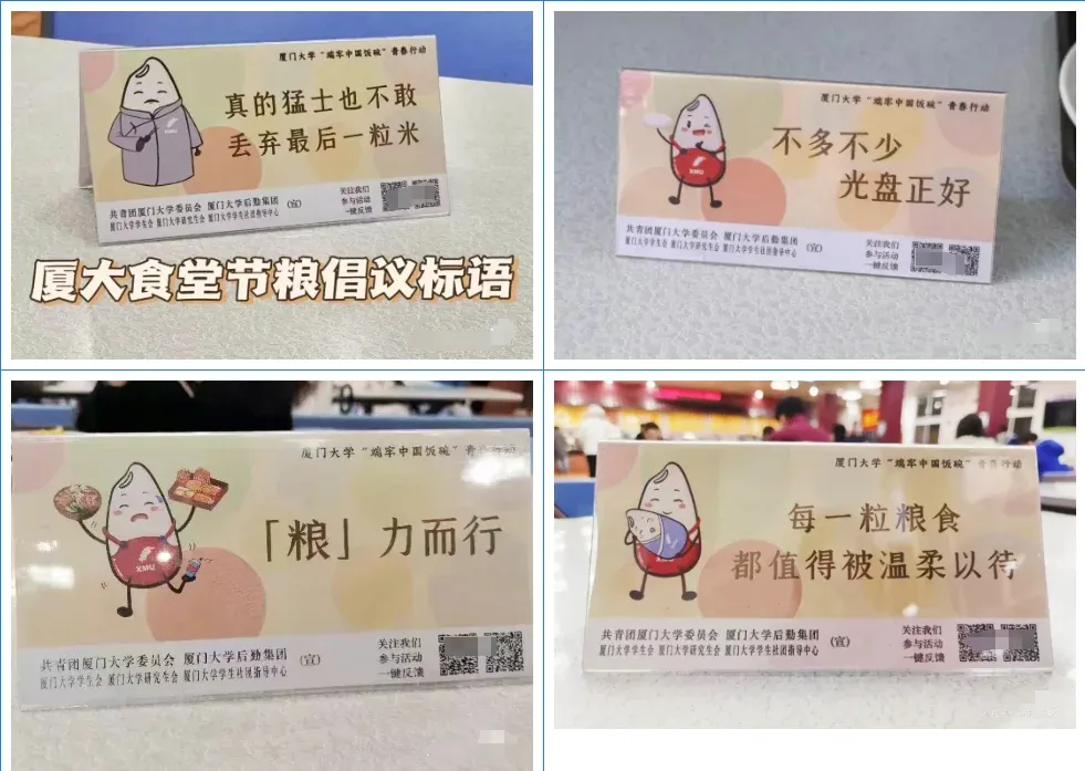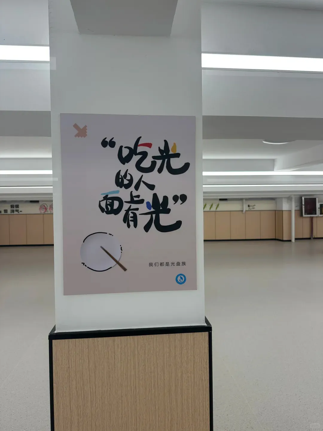 食堂的标语不用讲大道理,主要是倡导大家节约粮食、不要插队等。