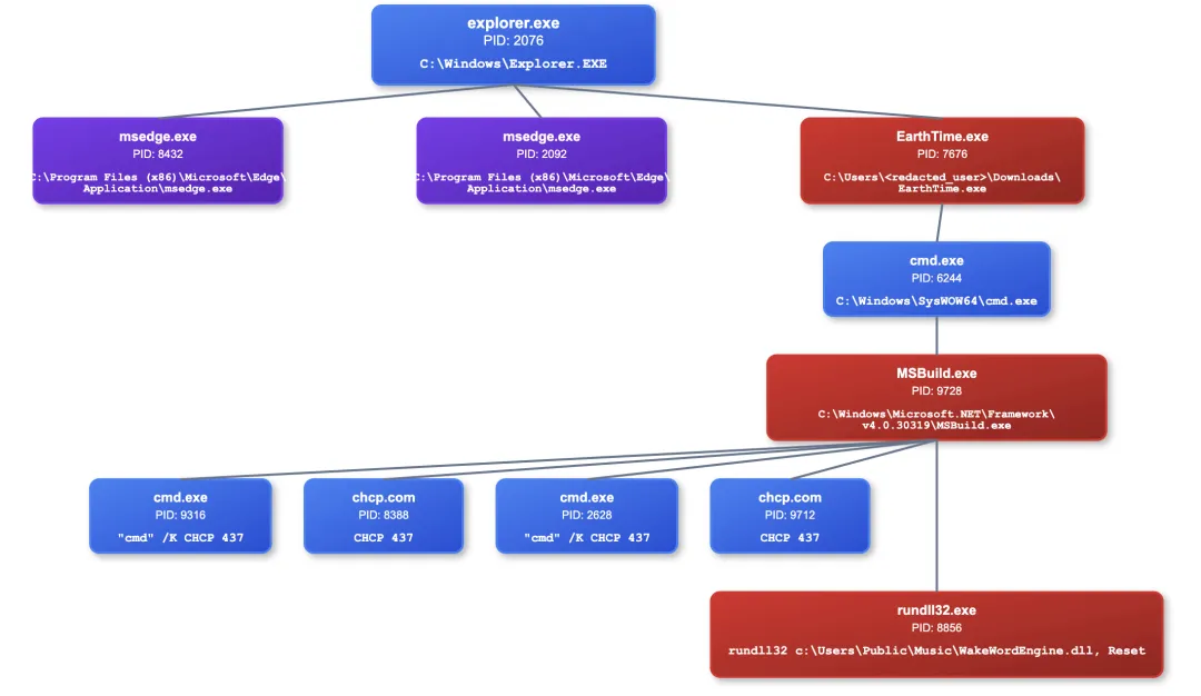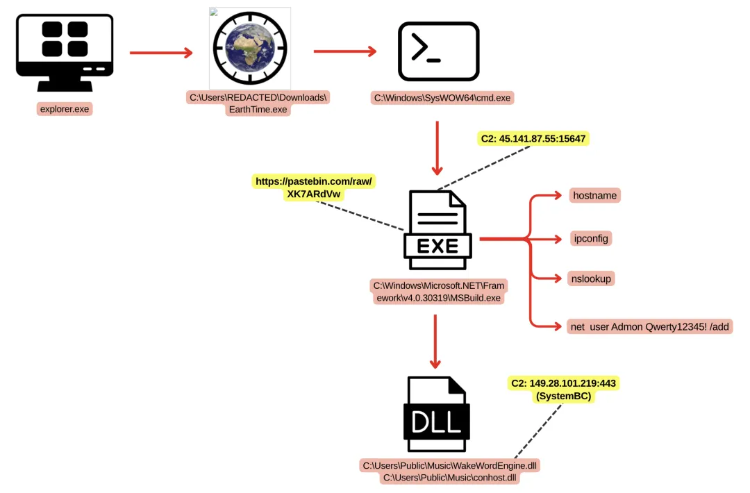 第一阶段 — SectopRAT 投递:EarthTime.exe 释放 cmd.exe,进而启动 MSBuild.exe(.NET 框架合法组件,被用于进程注入)。注入后的 MSBuild.exe 从 Pastebin 拉取 C2 配置,并与 45.141.87.55(端口 9000/15647)建立连接。