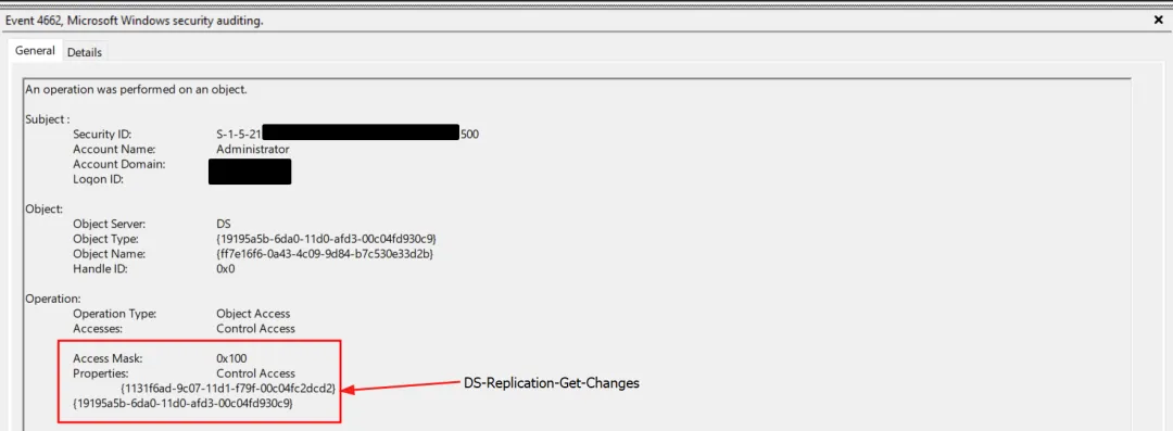 3. DCSync 攻击:利用特权账户执行 DCSync,通过 Windows Security Event ID 4662 可观测到 DS-Replication-Get-Changes(对象 ID:{1131f6ad-9c07-11d1-f79f-00c04fc2dcd2})的访问请求。