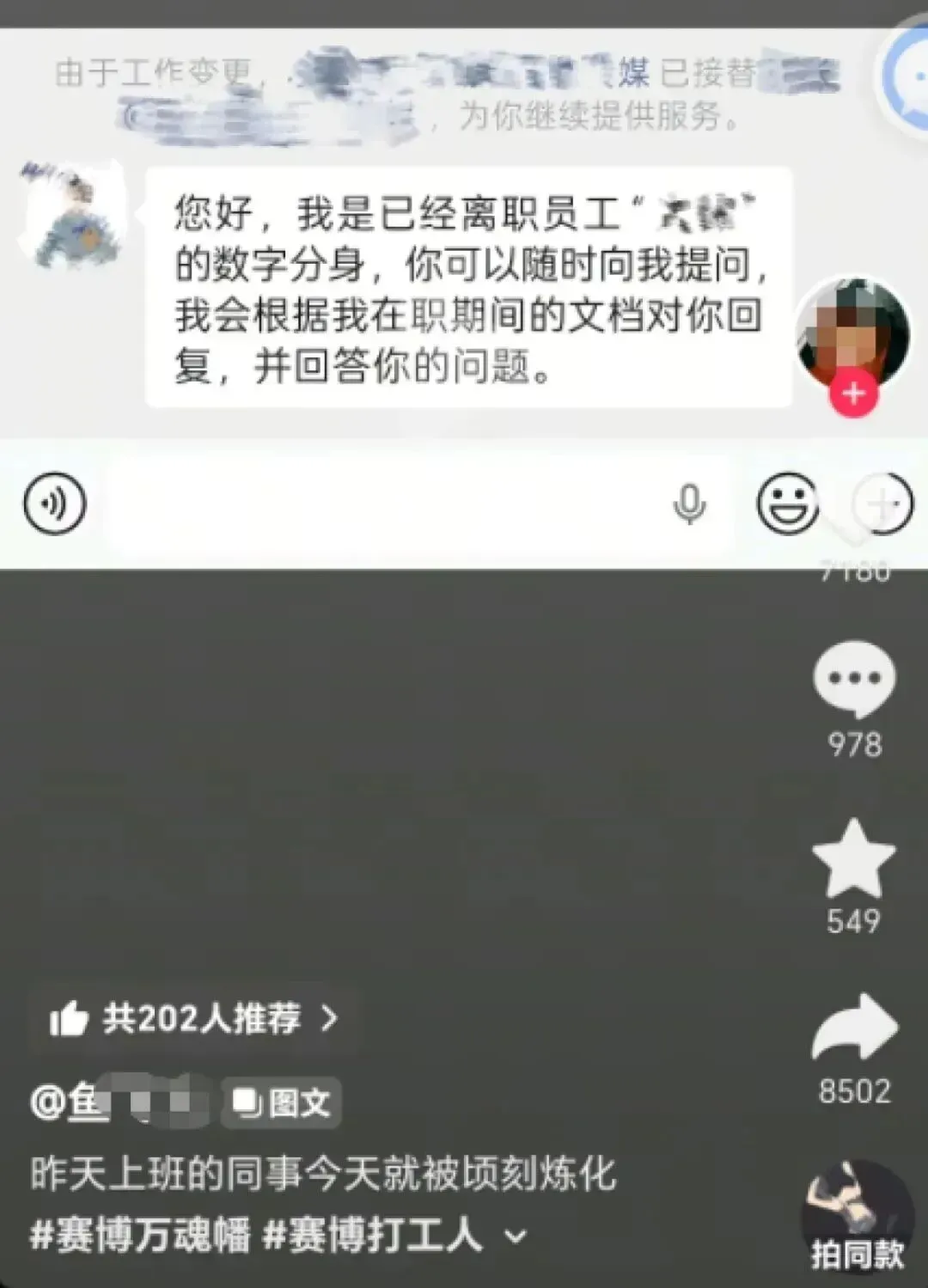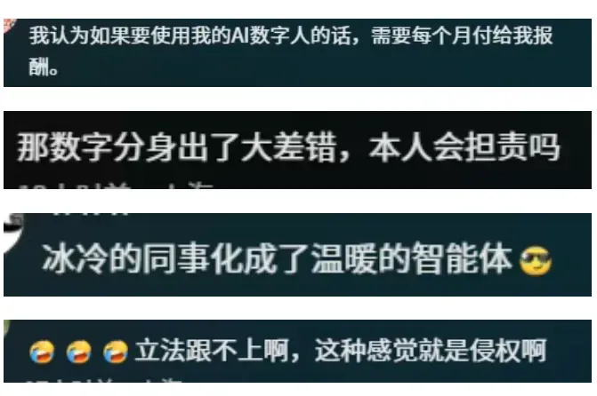 这个“炼化同事”的项目,不仅冲上了社交平台热搜,更让无数打工人破防了。网友调侃:这怎么不算另外一种形式的赛博永生呢?还有人质疑,员工多年积累的工作经验、个人数据,凭什么被公司拿去商业牟利?
