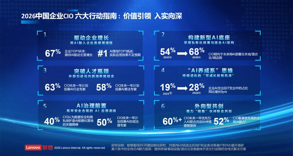 “这十个趋势背后其实都指向同一件事,即整个行业从+AI 正在进入到AI+阶段。”阿木表示。立足于这一背景,联想面向全行业620家政企CIO做了深入调研并发布了《指南》,结合这一报告,阿木明确指出2026年六大企业AI行动方向: