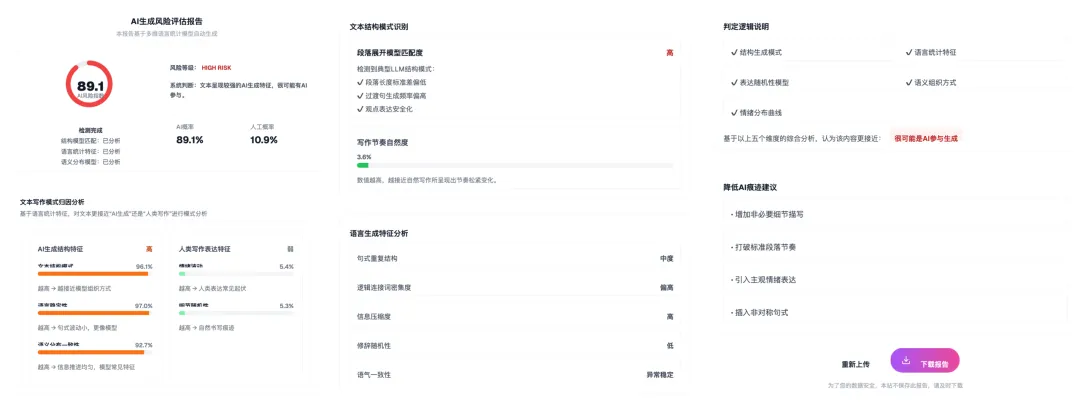 剧本AI检测系统基于文本结构模式识别、语言生成概率分析与语言稳定性建模,针对中文叙事文本进行专项训练,区别于通用检测模型,更适配情节类内容的表达方式,支持对短剧剧本、小说章节、 网络文学内容的进行检测,无论是平台审核、编辑筛选、版权风控还是内容合规辅助判断等场景都适用。