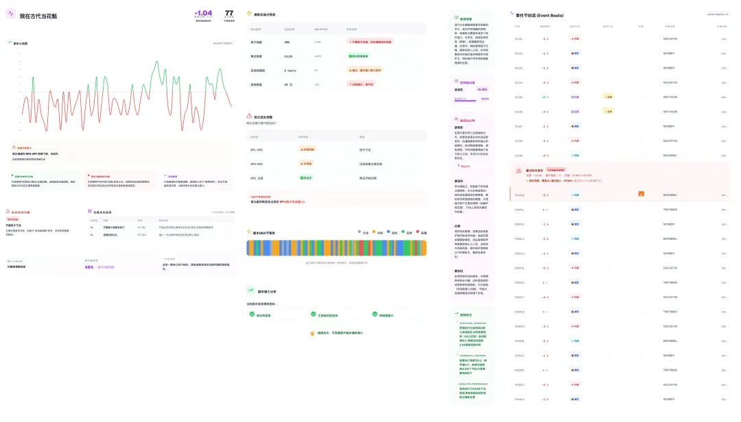 剧本心电图则主要是针对剧本“节奏怪怪的,看不出哪里出问题”、“观众中途滑走,原因不明确”、“剧情缺乏高光和情绪释放节点”等问题,可以帮助精准标出风险段、爽点和角色负载,让改稿更高效、更科学。