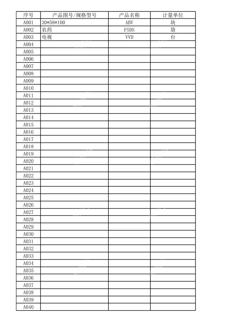 本文档是一份产品库存清单,旨在为仓储、采购人员提供精准的货品信息参考。文档包含A001至A100的产品编号,其中已完善信息的货品包括规格为30*58*100的ABV块装产品、FSDS袋装农药、VVD台装电视,其余编号预留待补充。清单采用清晰的表格结构,明确标注产品编号、规格型号、名称及计量单位,信息直观易查。无论你是仓储管理员进行库存盘点,还是采购人员梳理货品信息,这份清单都能为你提供准确的基础数据,助你高效完成货品管理工作。