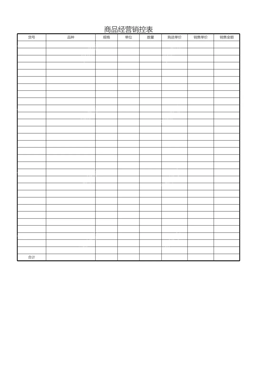 本文档是一份商品经营销控表模板,旨在帮助经营管理者高效统计商品进销数据。模板预设了货号、品种、规格、单位、数量、购进单价、销售单价、销售金额等核心统计字段,还设置了合计行便于数据汇总,无需自行搭建框架即可直接使用。无论你是个体商户还是门店管理者,这份模板都能为你提供规范的商品进销统计工具,助你清晰掌握商品经营数据。
