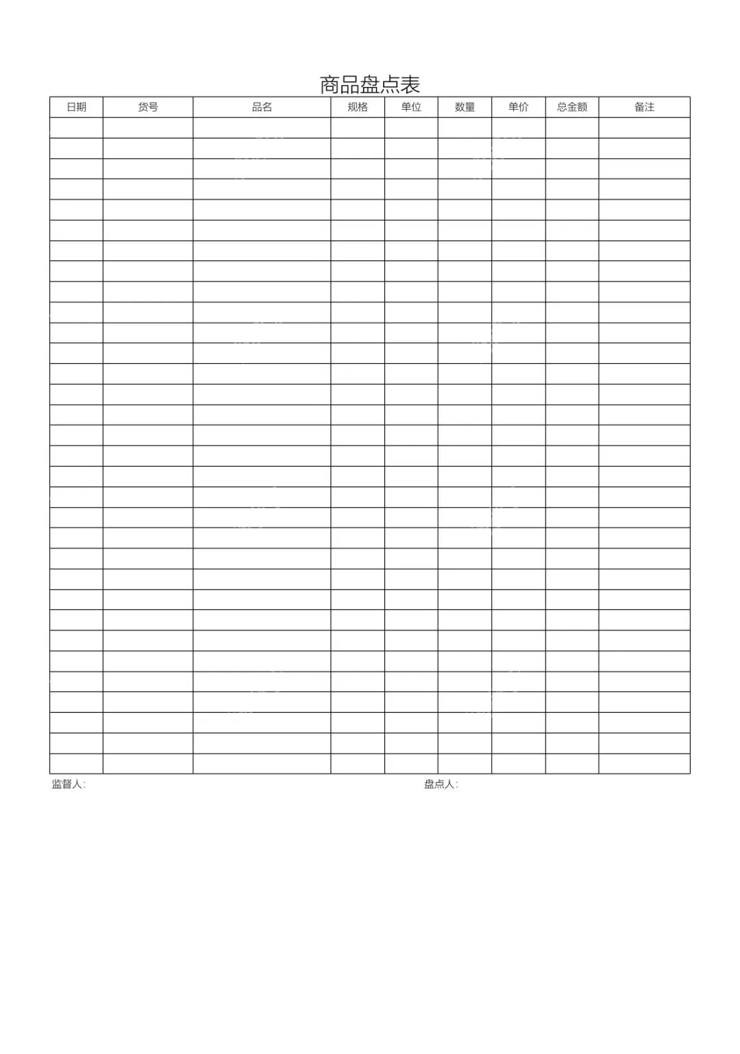 本文档是一份实用的商品盘点表模板,旨在帮助商家高效完成商品库存盘点工作。模板预设了日期、货号、品名、规格、单位、数量、单价、总金额、备注等核心统计栏位,还设置了监督人、盘点人签字栏,确保盘点流程规范可追溯。通过清晰的表格结构,让使用者能快速记录、统计商品库存信息,无需自行搭建框架。无论你是零售店主、仓库管理员还是门店运营人员,这份模板都能为你提供便捷的盘点工具,助你精准掌握库存情况。