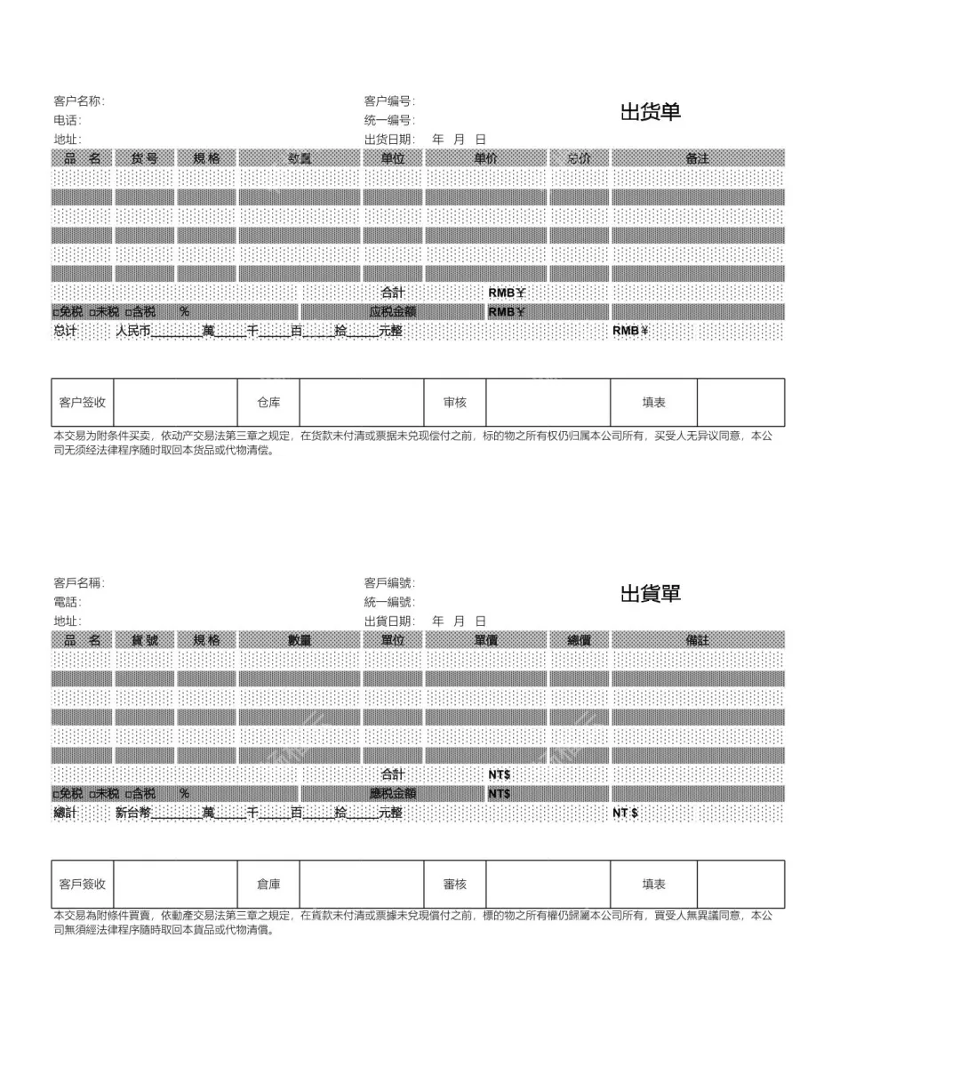 本文档是一份实用的双币种附条件买卖出货单模板,专为企业出货对账设计,兼具人民币和新台币两种币种核算功能。模板包含客户信息栏、货品明细栏、金额核算栏等完整模块,还明确标注了附条件买卖的所有权约定,即在货款付清前标的物所有权仍归卖方,保障企业权益。无论你是内资企业还是涉台贸易商家,这份模板都能帮你规范出货流程,规避交易风险,高效完成出货对账工作。