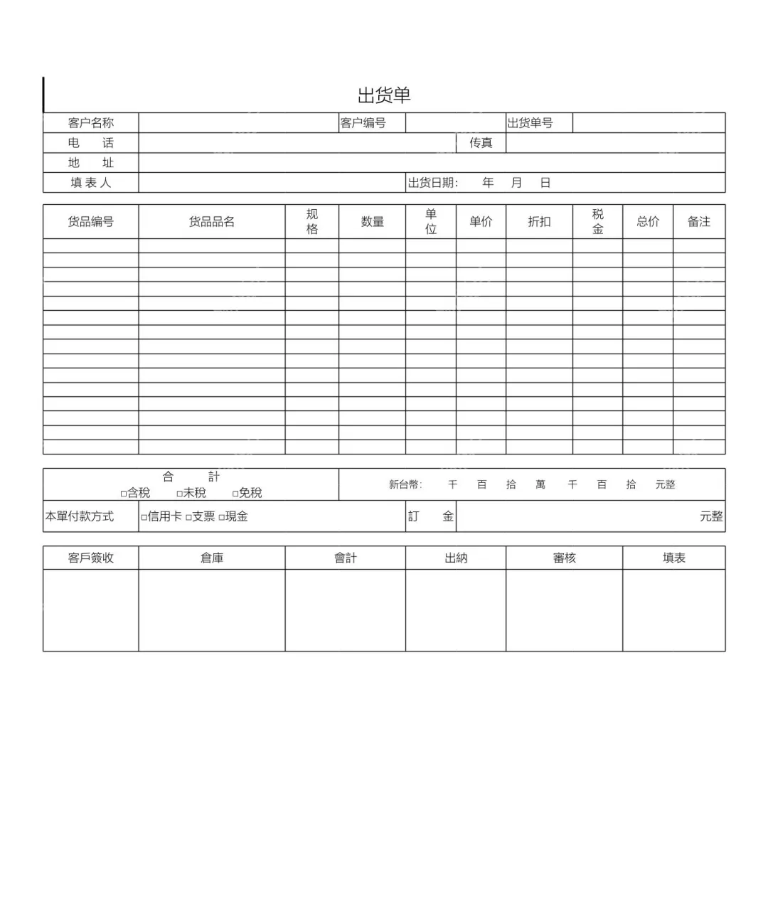 本文档是一份实用的标准出货单模板,旨在帮助企业规范出货流程、清晰记录交易信息。模板包含客户信息栏,可填写客户名称、编号、联系方式等基础资料;货品明细栏支持记录货品编号、品名、规格、数量、单价等核心信息,还设置了折扣、税金、总价等结算项;同时涵盖合计金额、税费类型、付款方式等结算模块,以及多岗位签字确认栏。无论你是企业仓管、财务人员还是销售从业者,这份模板都能帮你规范出货单据管理,避免交易信息遗漏,提升出货流程效率。