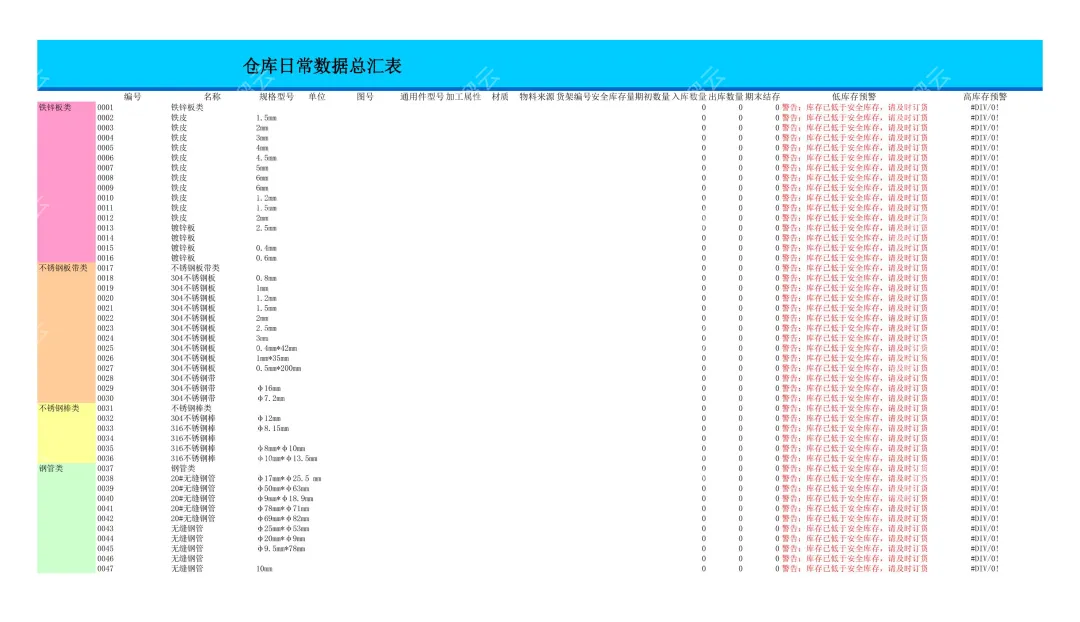 本文档是一份五金原料类的仓库日常数据总汇表,旨在帮助仓库管理人员高效管控库存、及时补货。表格详细汇总了铁锌板、不锈钢、铜材、塑料粒子等二十余类五金原料的编号、名称、规格型号等信息,同步展示期初、入库、出库及期末结存数据,并针对库存低于安全值的物料自动发出补货警告。无论你是仓库管理员、采购专员还是生产物料负责人,这份表格都能为你提供清晰的库存动态,助你避免缺料停产风险,优化库存管理效率。