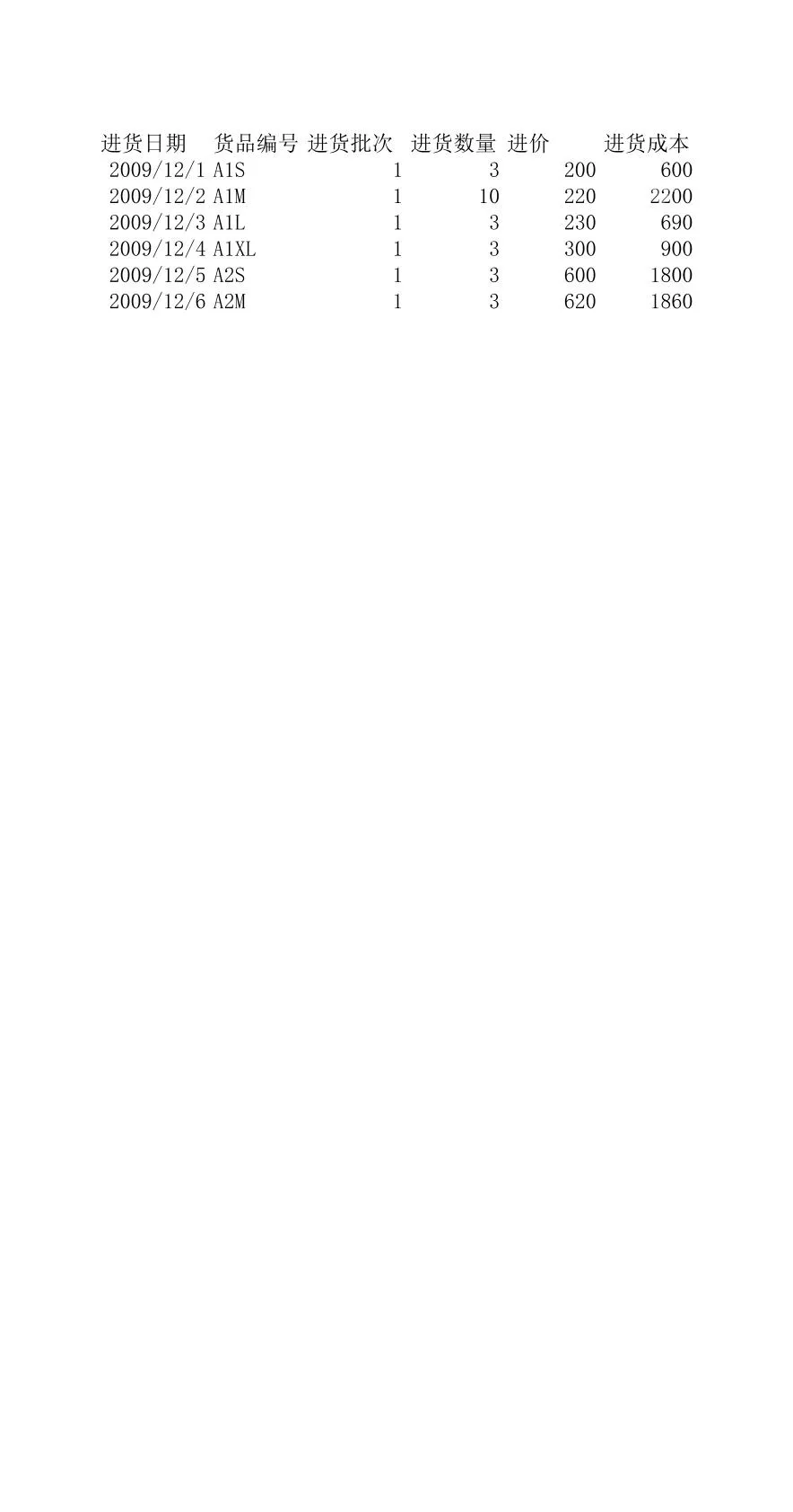 102009年12月服饰进货成本明细
