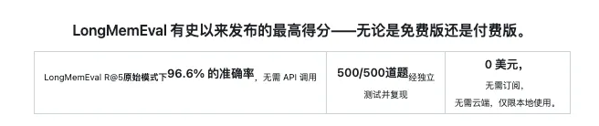 它在学术界条件苛刻的长文本记忆测试集 LongMemEval 拿到了 96.6分。这套考题覆盖了信息找回、多轮次连贯推理和时序演进等复杂评判维度。系统的单机成绩打破了现存所有公开方案的纪录。
