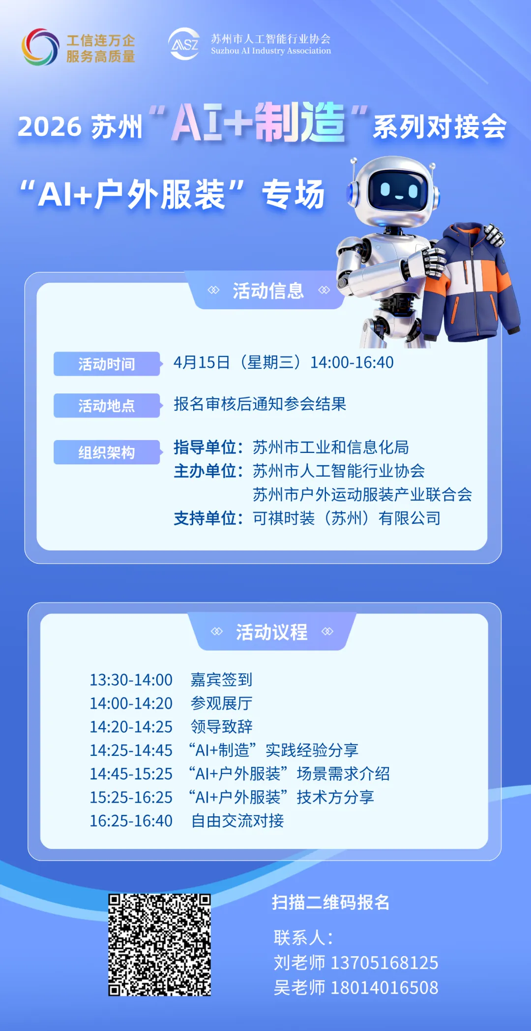 本次活动将进行“AI+制造”实践经验分享,同时聚焦户外服装领域四大场景需求,搭建精准高效的供需对接平台,促进人工智能技术与苏州制造优势、市场优势有机融合、协同赋能。