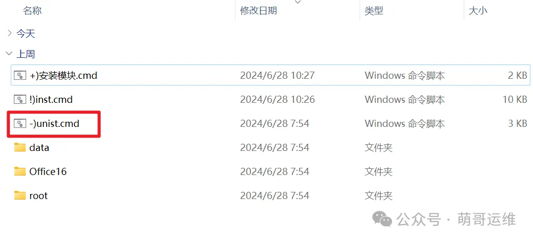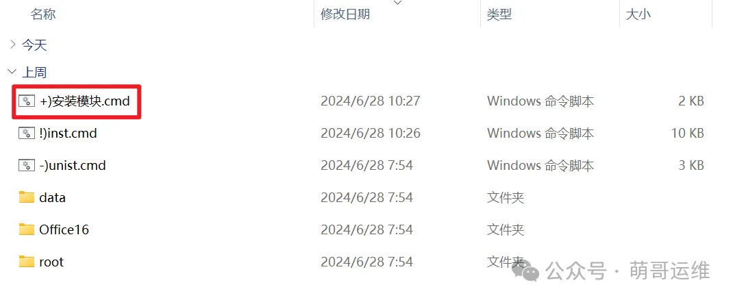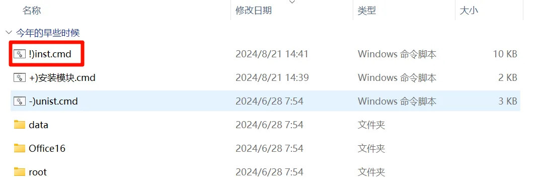 然后我们需要安装哪个版本就解压缩相应的软件包,萌哥这里以office 2024为例,双击【!)inst】安装脚本(软件使用ohook永久激活,最好提前关闭杀毒软件,安装前确保电脑中没有安装office)