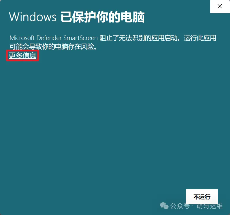 Windows对未识别的应用会默认阻止,点击【更多信息】,然后点击【仍要运行】