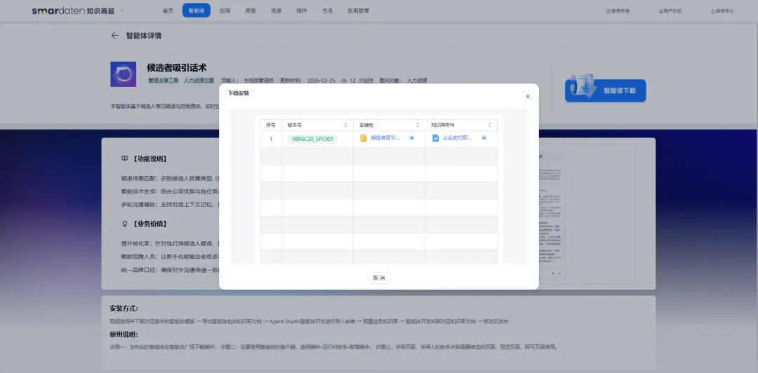 列表页选择对应的智能体模版 → 详情页导出智能体包&知识库文档 → Agent Studio智能体开发进行导入安装 → 预置业务知识库 → 智能体开发关联对应知识库文档 → 修改后发布 → 智能体广场下载插件使用