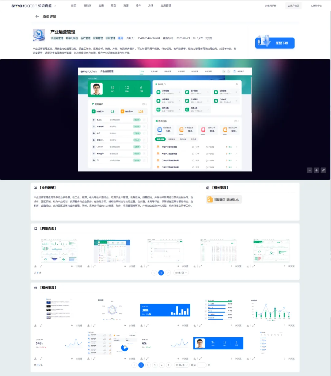 关联资产:详情页下方清晰展示该原型所关联的页面模板和资源文件,一键获取完整资产包