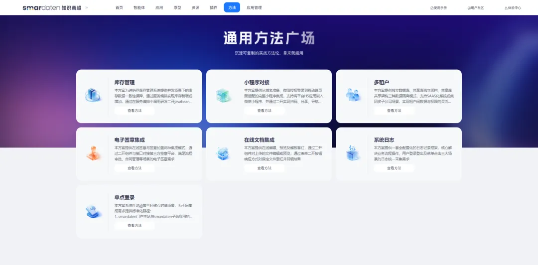 方法模块提供从历史交付项目中提炼并沉淀形成的标准化设计方案文档,涵盖适用业务场景、技术选型、设计思路及可选的应用包。