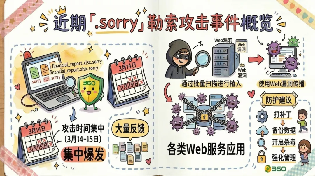 此外,一款Sorry后缀的勒索软件同样借助Web漏洞快速扩散,引发集中受害。360数字安全集团接获大量反馈,受害文件被加密后统一添加.sorry后缀,攻击时间集中在3月14日至15日。360安全智能体监测发现,该勒索软件采用无文件攻击手段,从入侵到加密全程仅在内存中运行,不向硬盘写入任何恶意文件。综合分析,其攻击手法与当前活跃的Tellyouthepass家族高度相似,而勒索信格式则更接近WormHole家族。