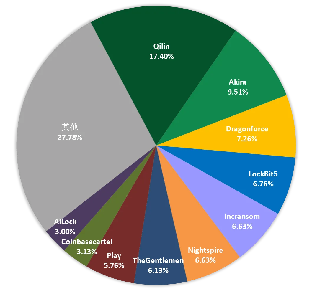 此外,随着双重及多重勒索模式的加速普及,数据泄露风险进一步加剧。据360安全智能体监测,本月全球新增受影响政企机构达801家。从主要勒索家族的收益占比来看,Qilin、Akira与Dragonforce分别以17.40%、9.51%和7.26%位列前三。