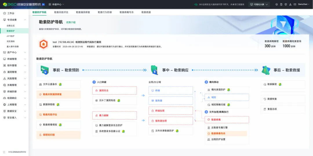 加密后易恢复:内置大量360独家文档解密工具及云端解密平台,云端支持1000+类勒索文件解密、本地支持100+类勒索文件解密,并通过终端安全智能体实现加密后的全方位恢复工作。